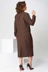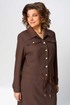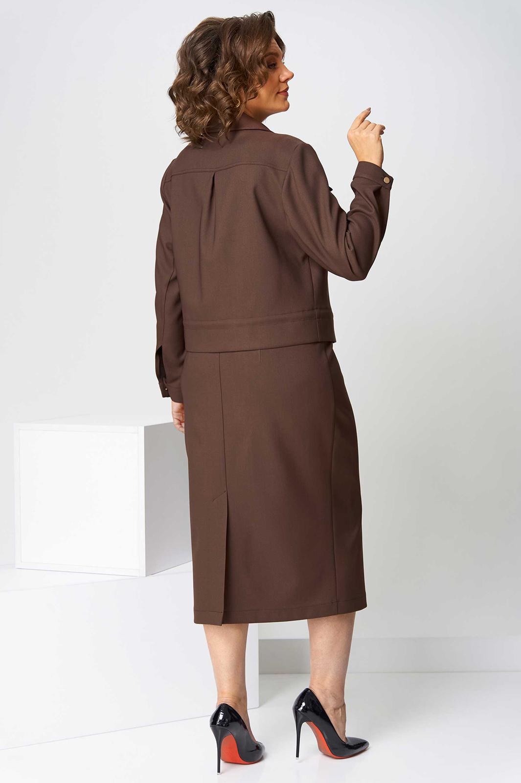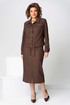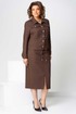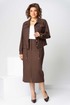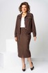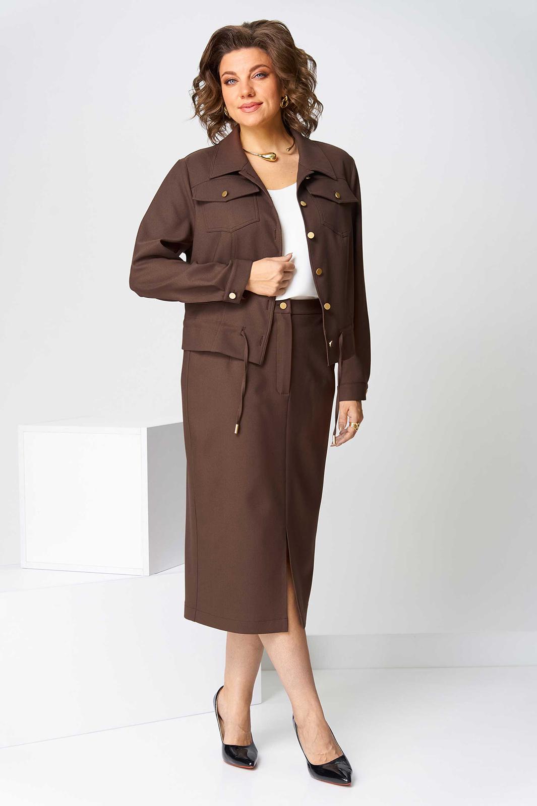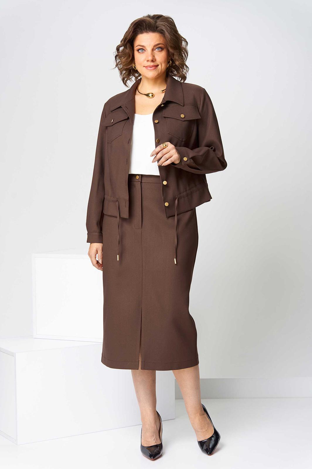 Костюм юбочный (двойка) женский свободного силуэта, состоит из жакета и юбки. Жакет без подкладки с центральной застежкой на петли и пуговицы, воротник отложной, рукав длинный с манжетом, застегивающимся на петлю. По спинке - кокетка. По переду кокетка и рельефы, выходящие из нее, накладные нагрудные карманы с клапанами. По низу жакета кулиска со шнуром и наконечниками.