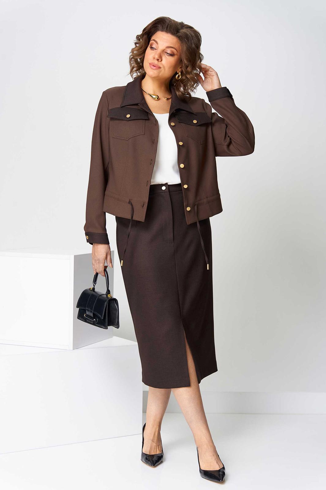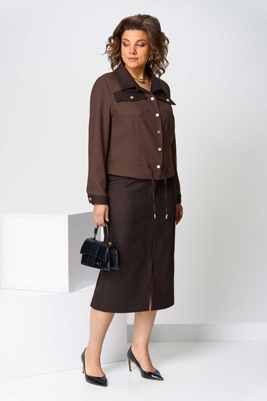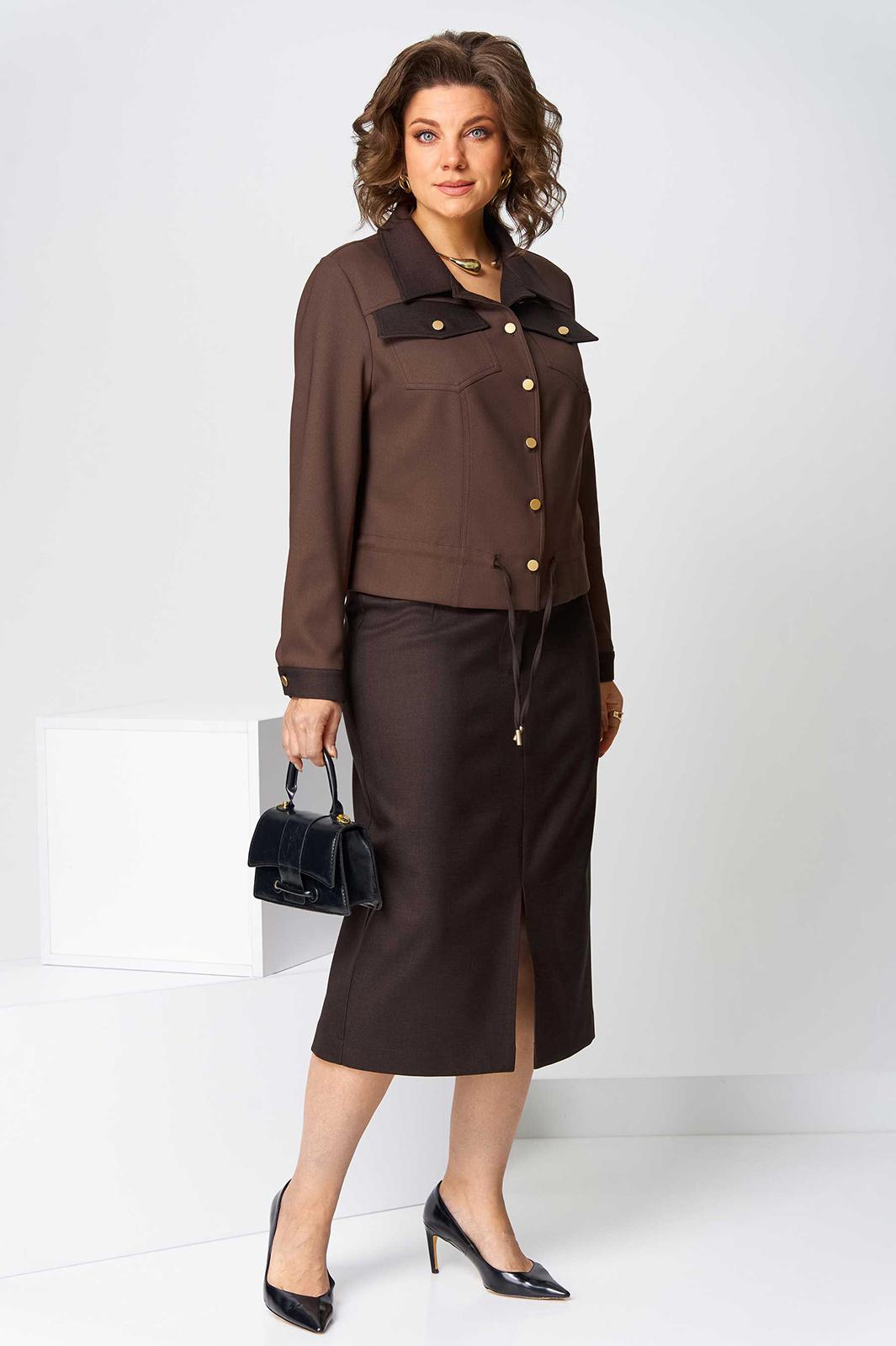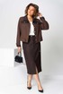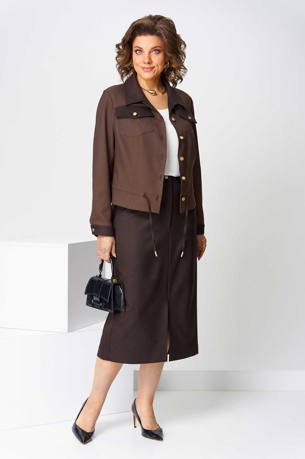 Костюм юбочный (двойка) женский свободного силуэта, состоит из жакета и юбки. Жакет без подкладки с центральной застежкой на петли и пуговицы, воротник отложной, рукав длинный с манжетом, застегивающимся на петлю. По спинке - кокетка. По переду кокетка и рельефы, выходящие из нее, накладные нагрудные карманы с клапанами. По низу жакета кулиска со шнуром и наконечниками.