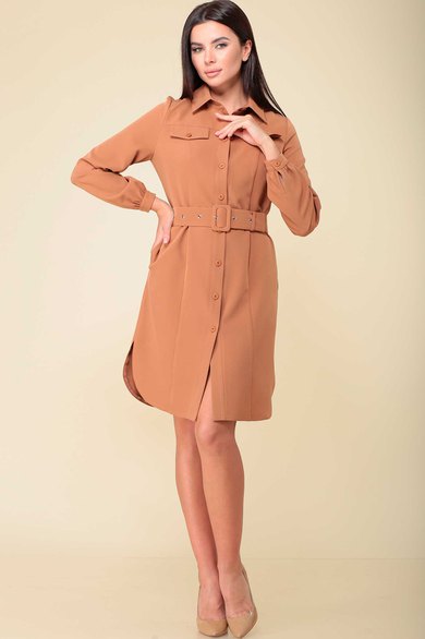 Описание. Платье женское молодежное полуприлегающего силуэта, из плательной стрейчевой ткани. Воротник мужской на стойке. Рукав длинный присборенный на манжете. Манжет на пуговицу. Застежка центральная по переду на планку с пуговицами. Перед с кокетками и рельефами. Клапан из под кокетки. Карманы в боковых швах. Спинка с таллиевыми вытачками. К платью прилагается пояс на пряжку.
