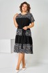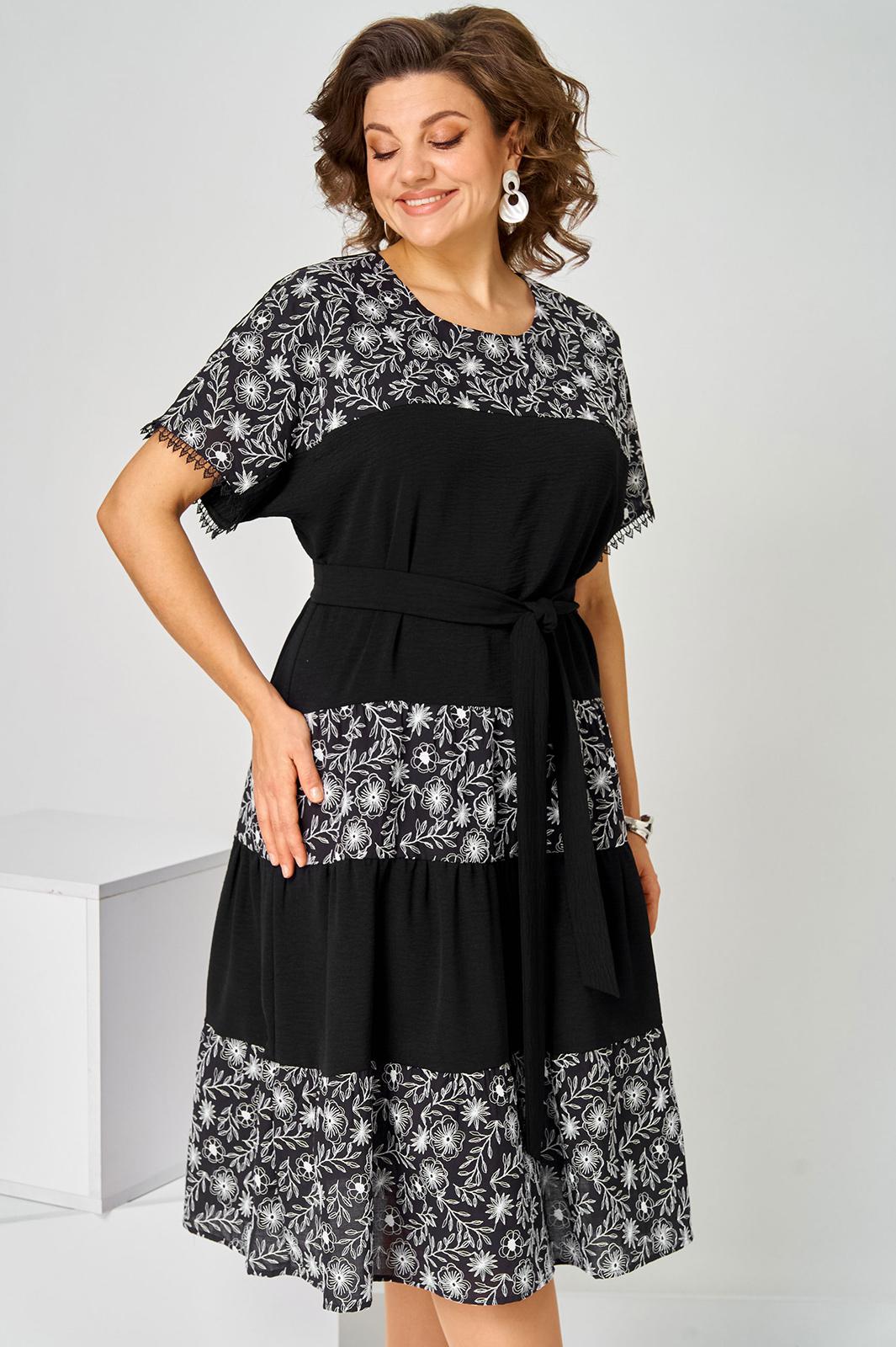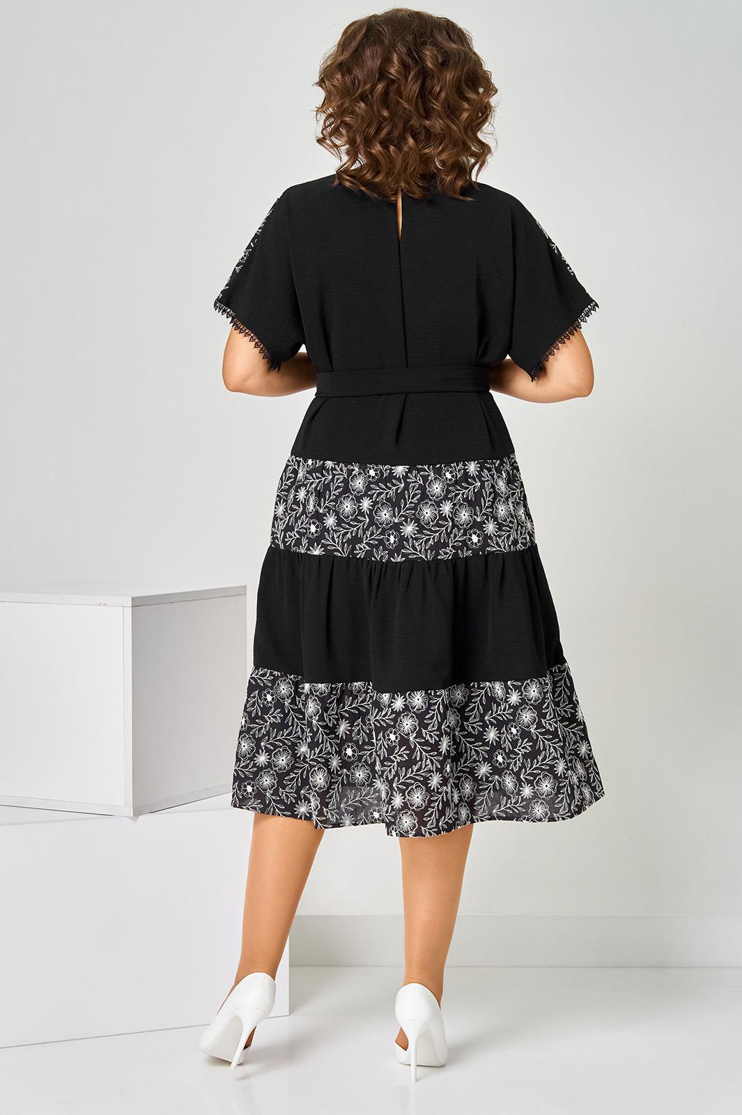 Платье женское летнее, полуприлегающего силуэта из хлопковой ткани двух видов, по низу кружево. Горловина округлая. Рукав спущенный. По переду кокетка, платье отрезное по линии бедер с тремя рядами присборенных воланов. Спинка свободная. Вверху застежка на петлю. К платью прилагается пояс.