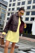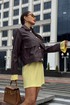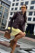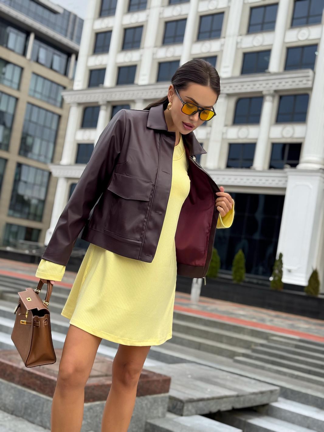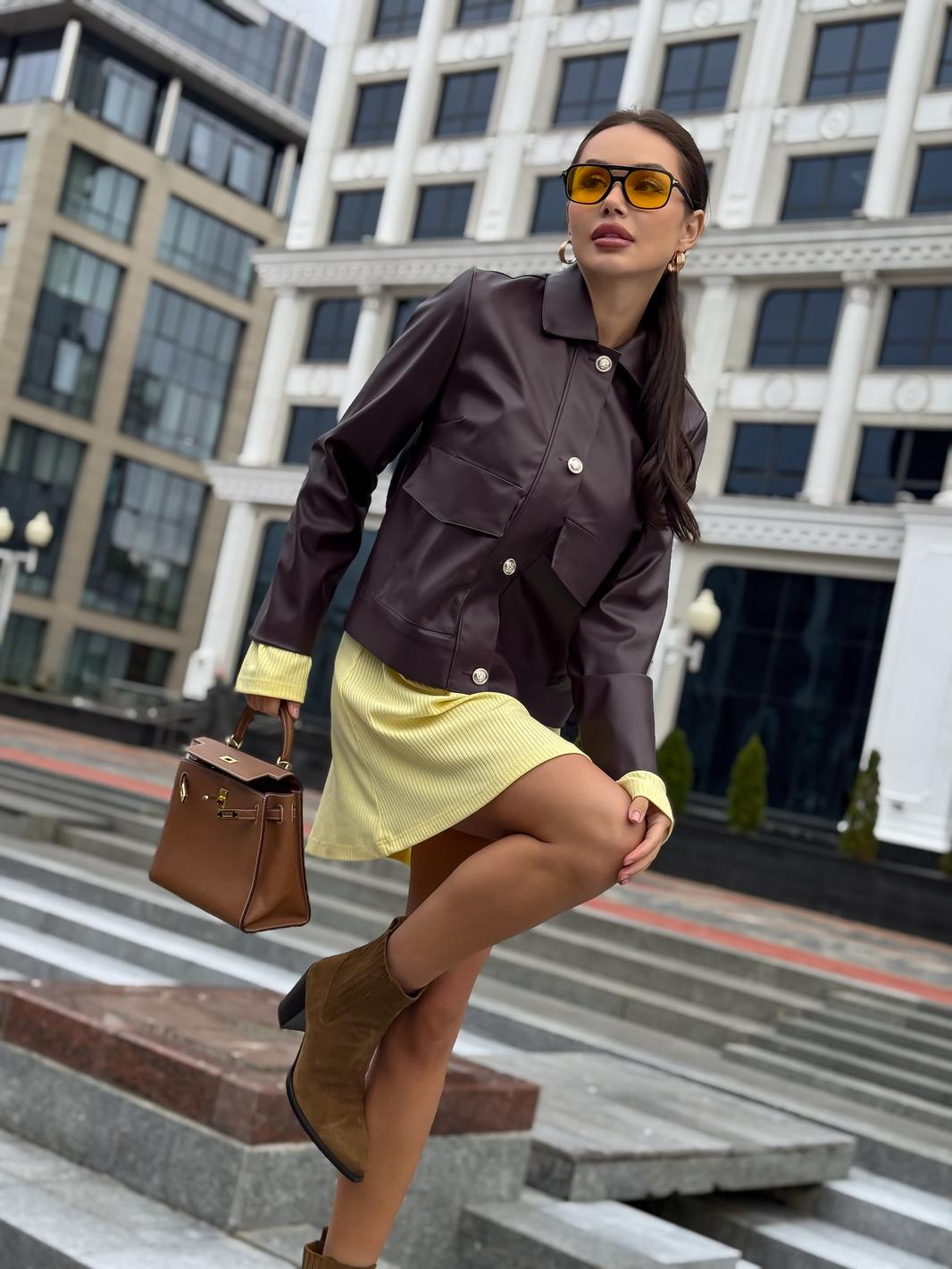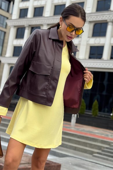 Жакет однобортный, на подкладке, выполнен из эко-кожи. Обработан молнией разъёмной молнией по центру переда, закрывающейся планкой с пуговицами. Воротник отложной, рубашечного типа. Рукава втачные одношовные, прямые. По передним половинкам обработаны накладные карманы с клапаном.