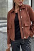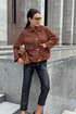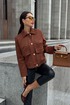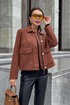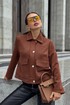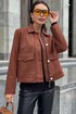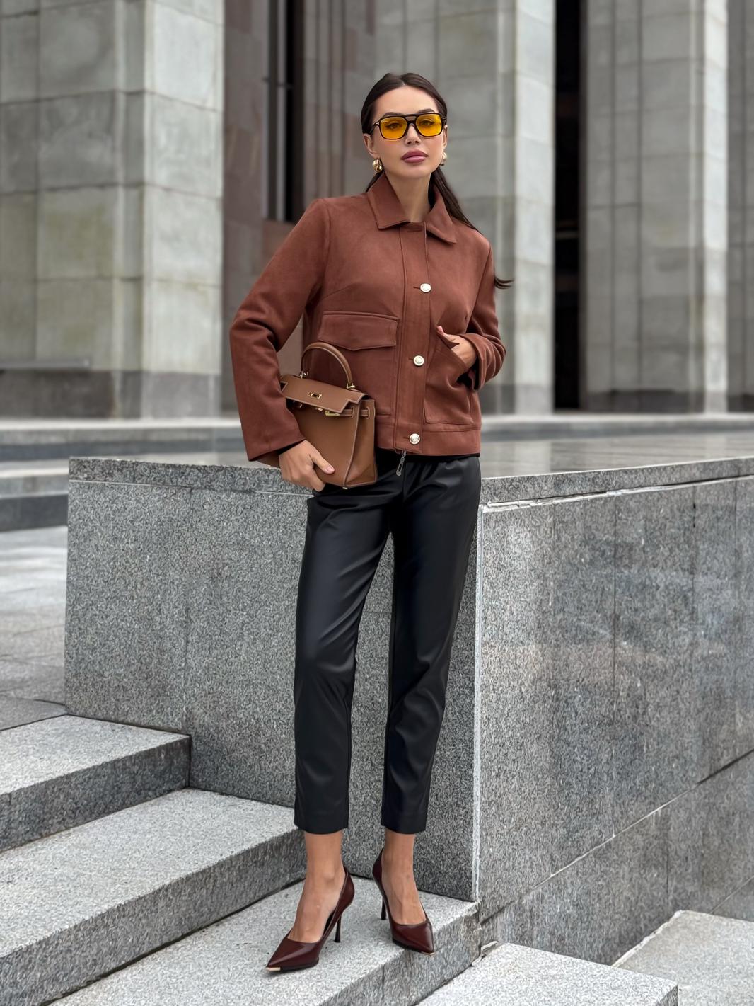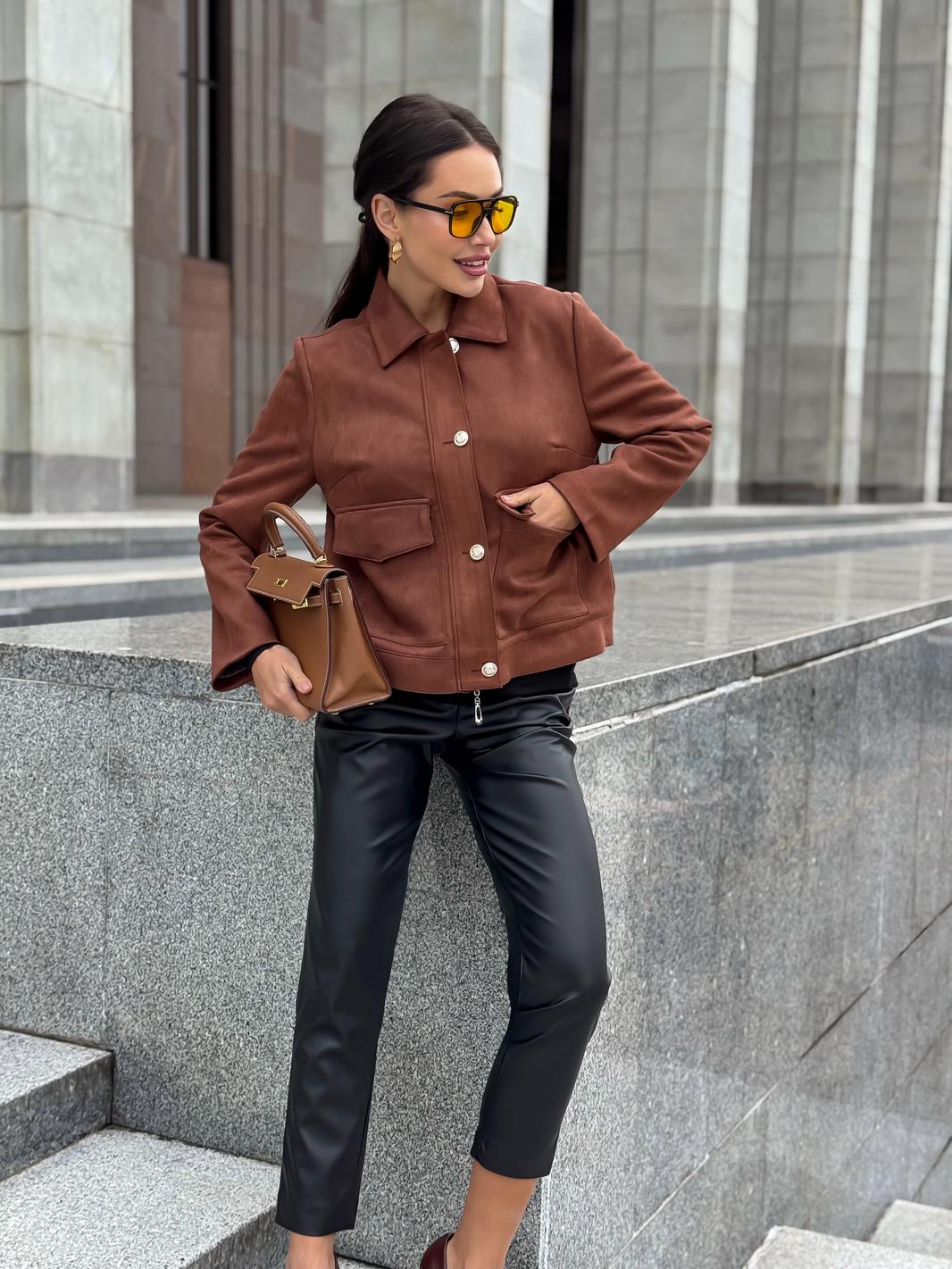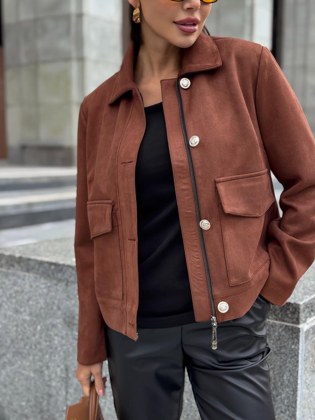 Жакет однобортный, на подкладке, выполнен из эко-замши. Обработан молнией разъёмной молнией по центру переда, закрывающейся планкой с пуговицами. Воротник отложной, рубашечного типа. Рукава втачные, одношовные, прямые. По передним половинкам обработаны накладные карманы с клапаном.