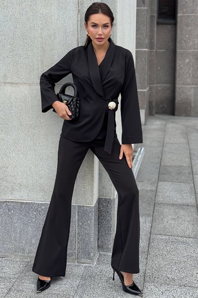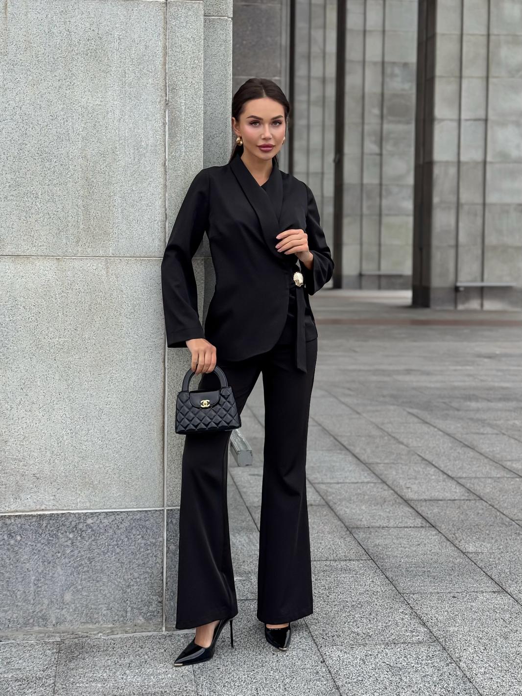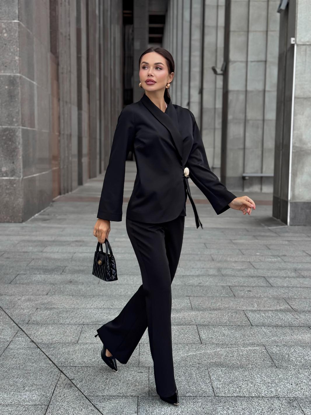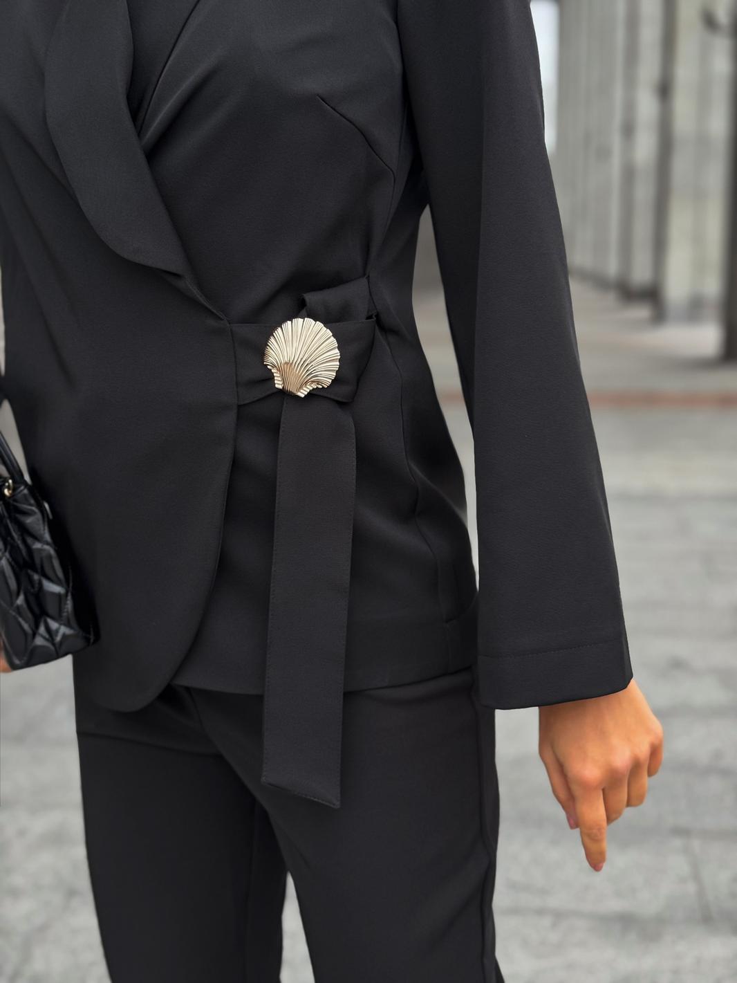 Жакет без подкладки, швы обработаны кантом в цвет изделия. Рукав втачной, прямой, одношовный. Воротник шаль. Застежка на притачной пояс, дополнен съёмной пряжкой золотистого цвета.