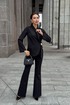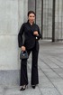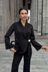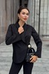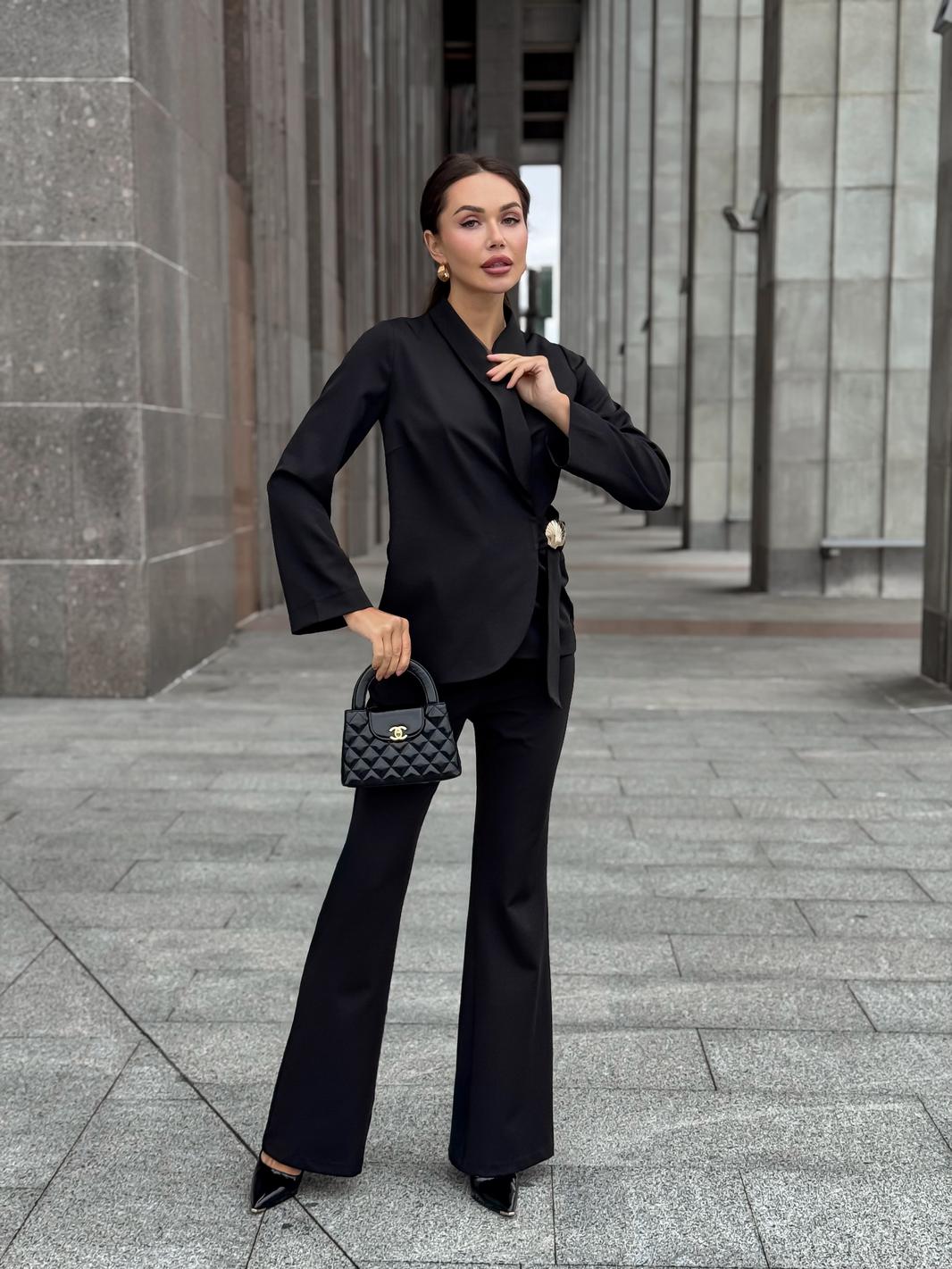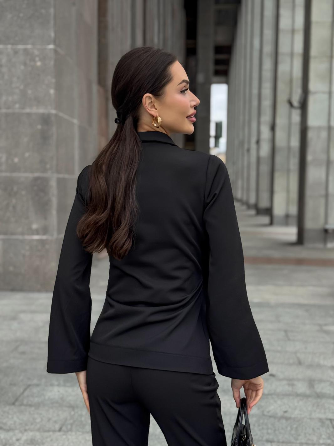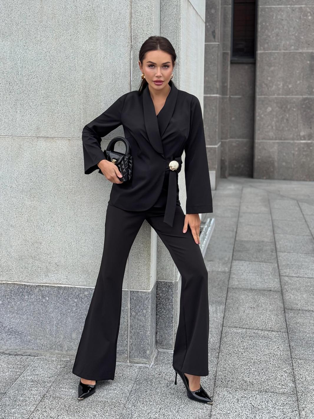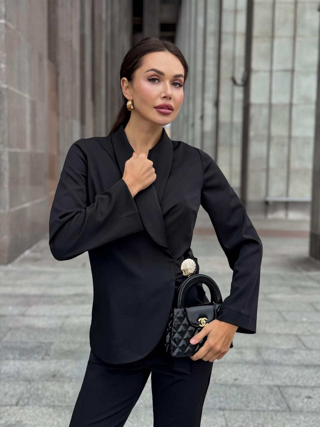 Жакет без подкладки, швы обработаны кантом в цвет изделия. Рукав втачной, прямой, одношовный. Воротник шаль. Застежка на притачной пояс, дополнен съёмной пряжкой золотистого цвета.