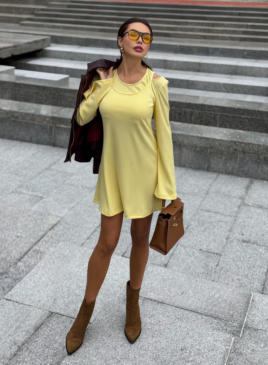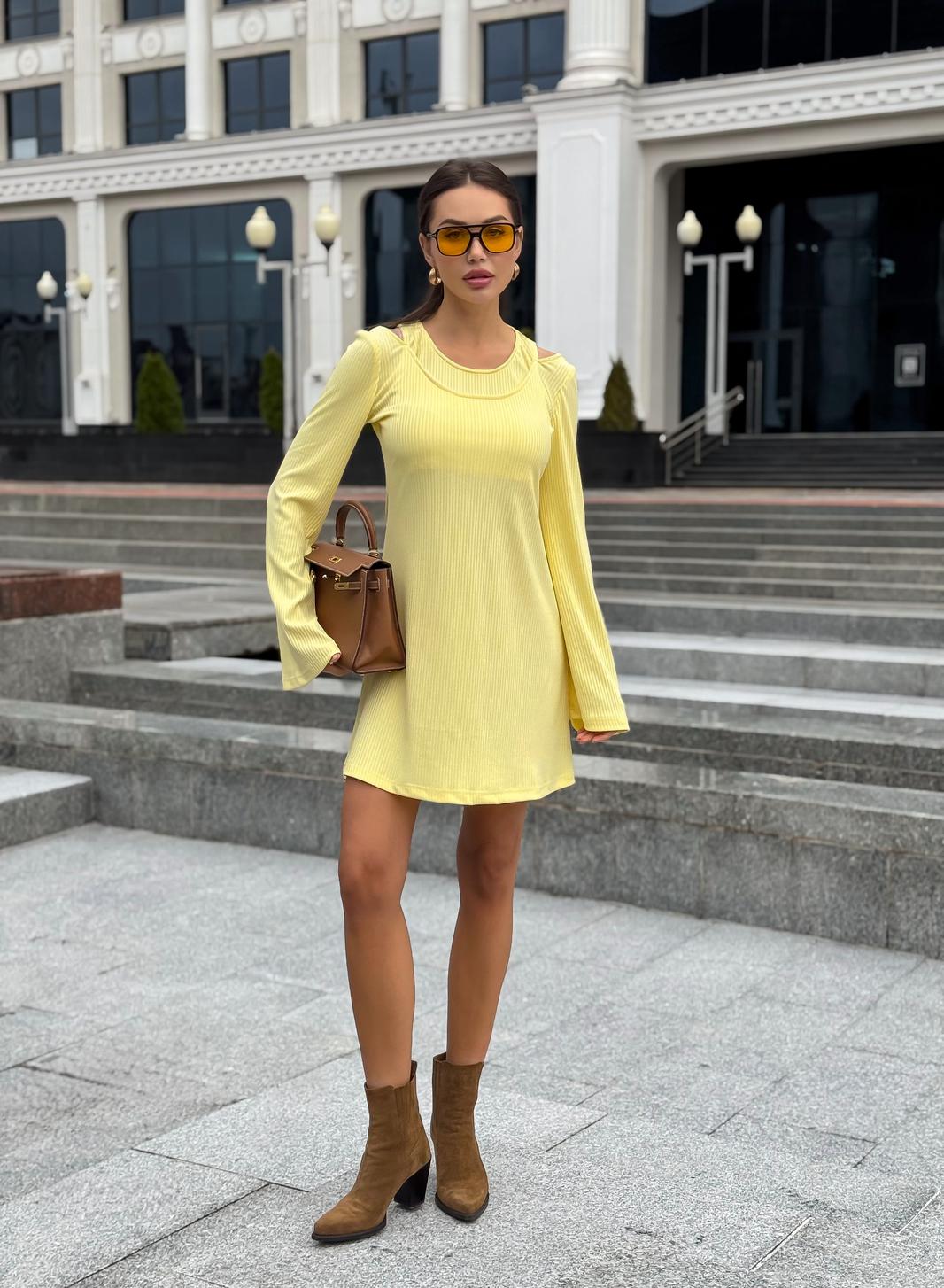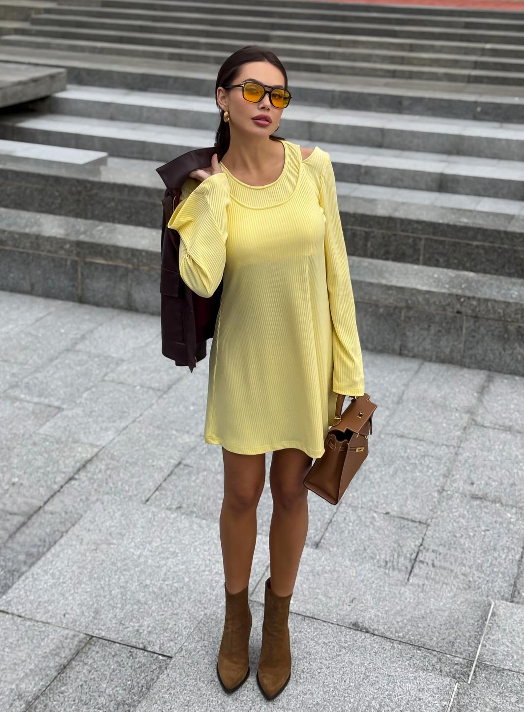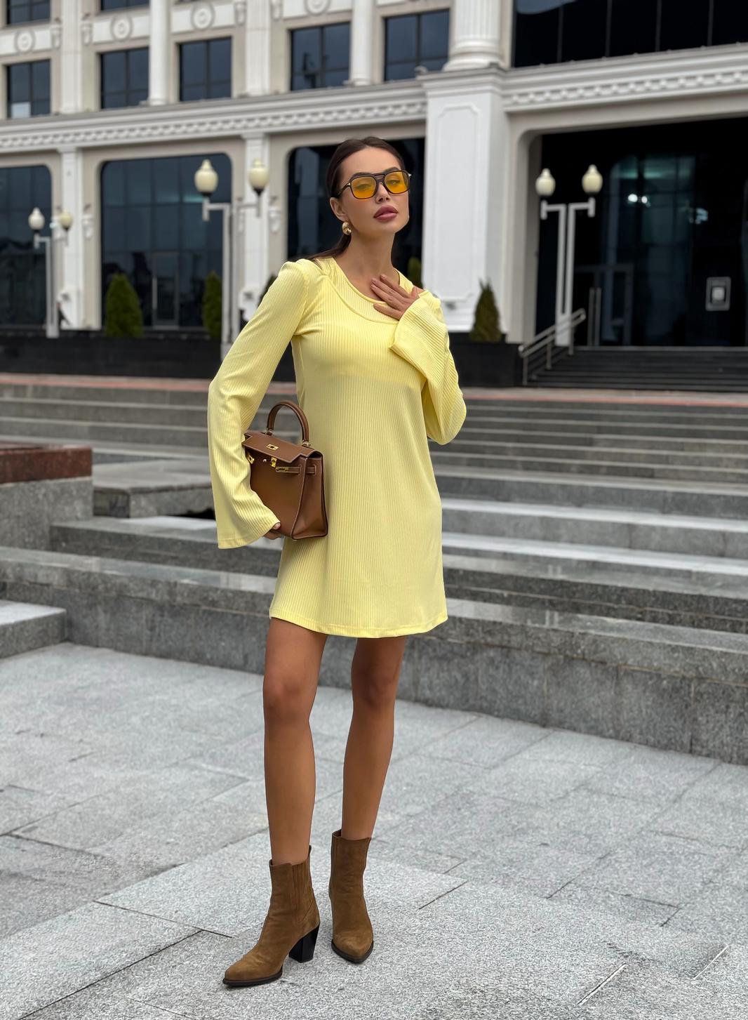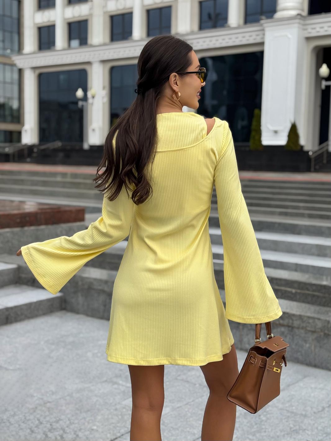 Платье в длине мини, выполнено из трикотажного полотна, который представляет собой ряд выпуклых вертикальных полос из «косичек». Верх платья обработан глубоким вырезом-лодочка и бретелями, имитирующими майку. Рукав расширяется к низу, по форме клеш. Платье хорошо тянется, идеально сядет на фигуру.