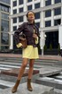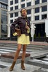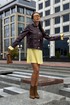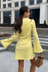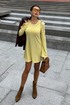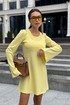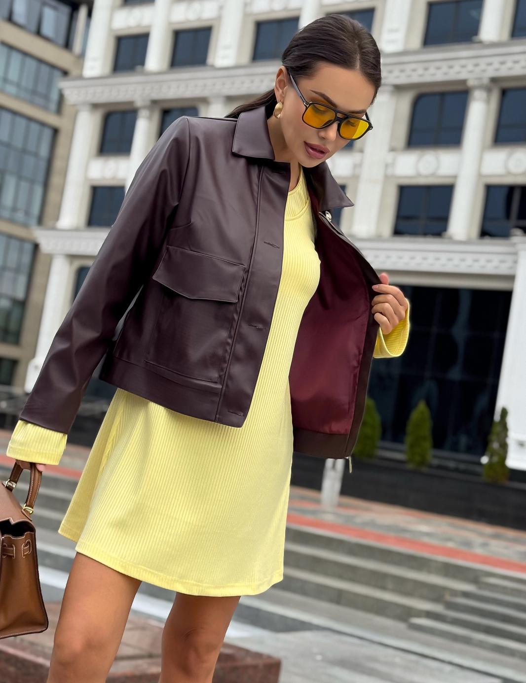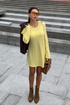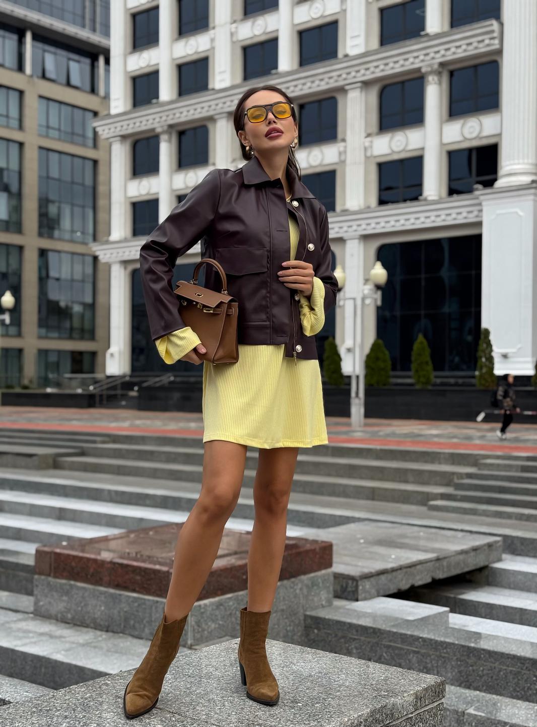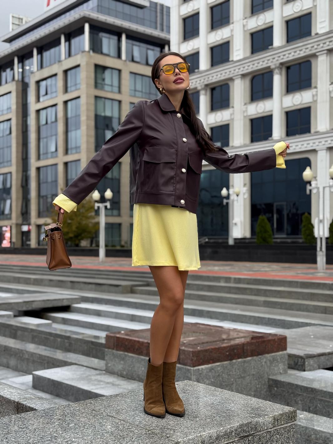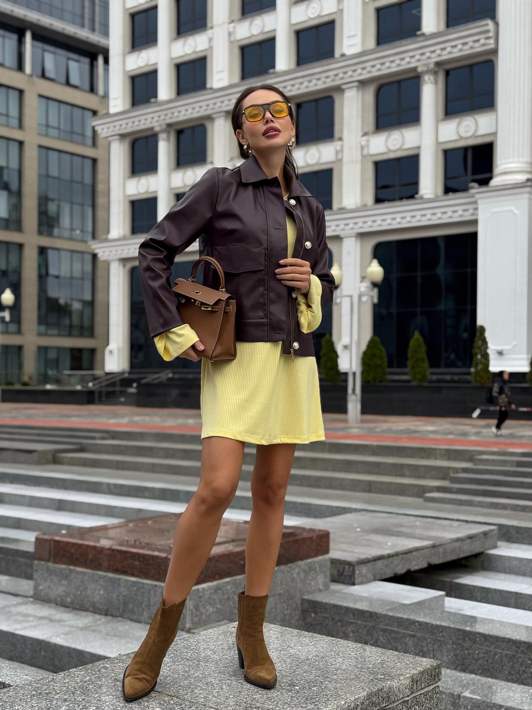 Платье в длине мини, выполнено из трикотажного полотна, который представляет собой ряд выпуклых вертикальных полос из «косичек». Верх платья обработан глубоким вырезом-лодочка и бретелями, имитирующими майку. Рукав расширяется к низу, по форме клеш. Платье хорошо тянется, идеально сядет на фигуру.