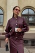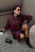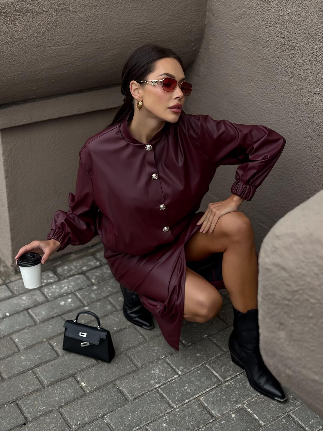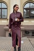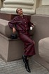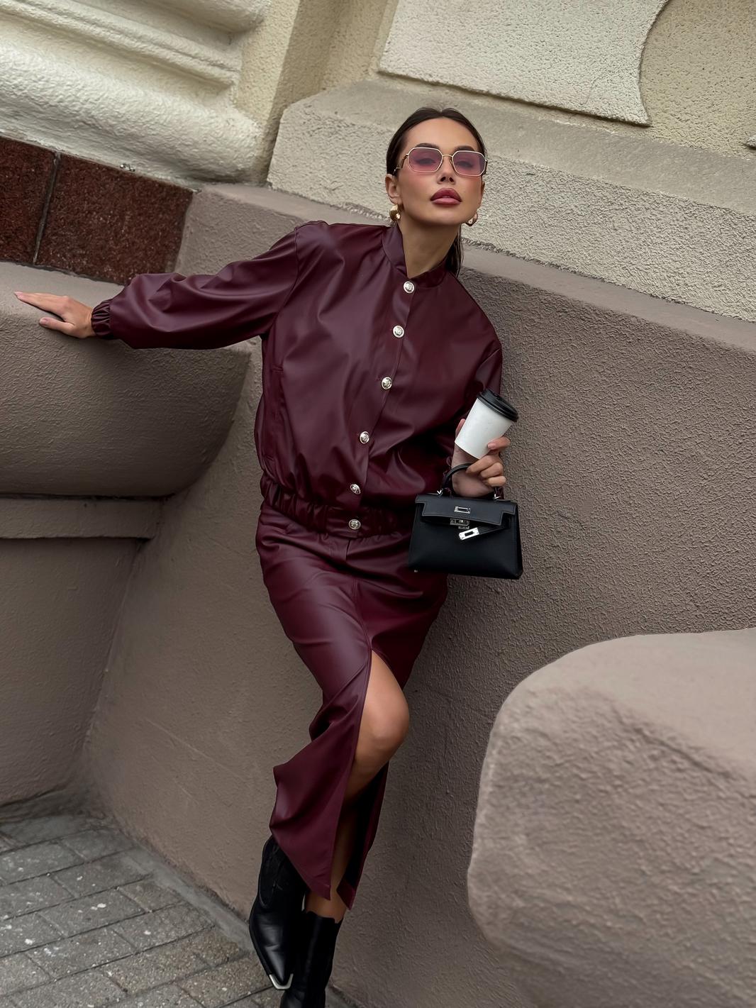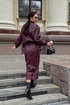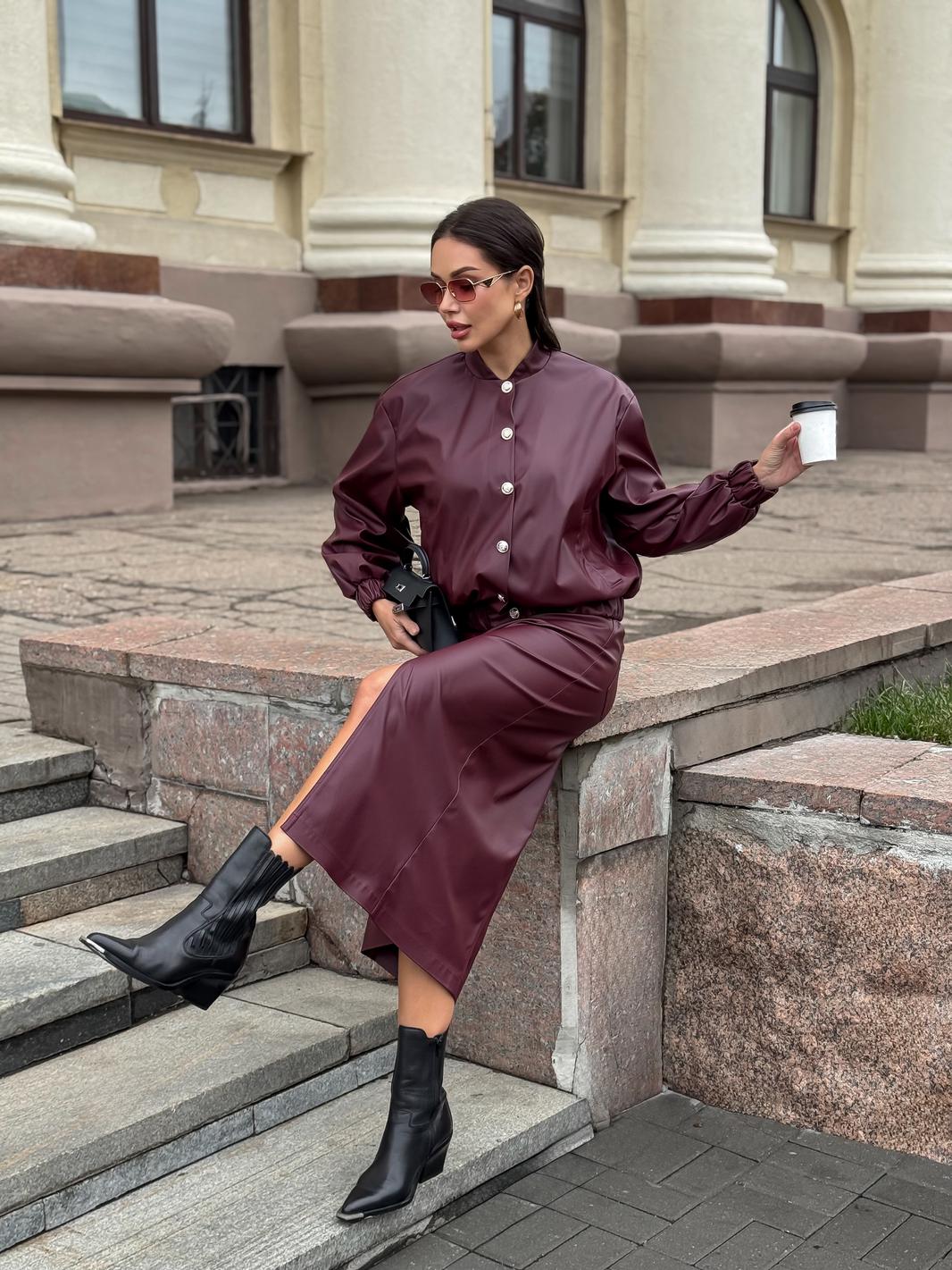 Юбка в длине миди, выполнена из эластичной синтетической кожи. Застёжка - гульфик с молнией, пуговица. По центру переда обработан разрез. По задним половинам настрочены накладные карманы. По переду обработаны втачные карманы.