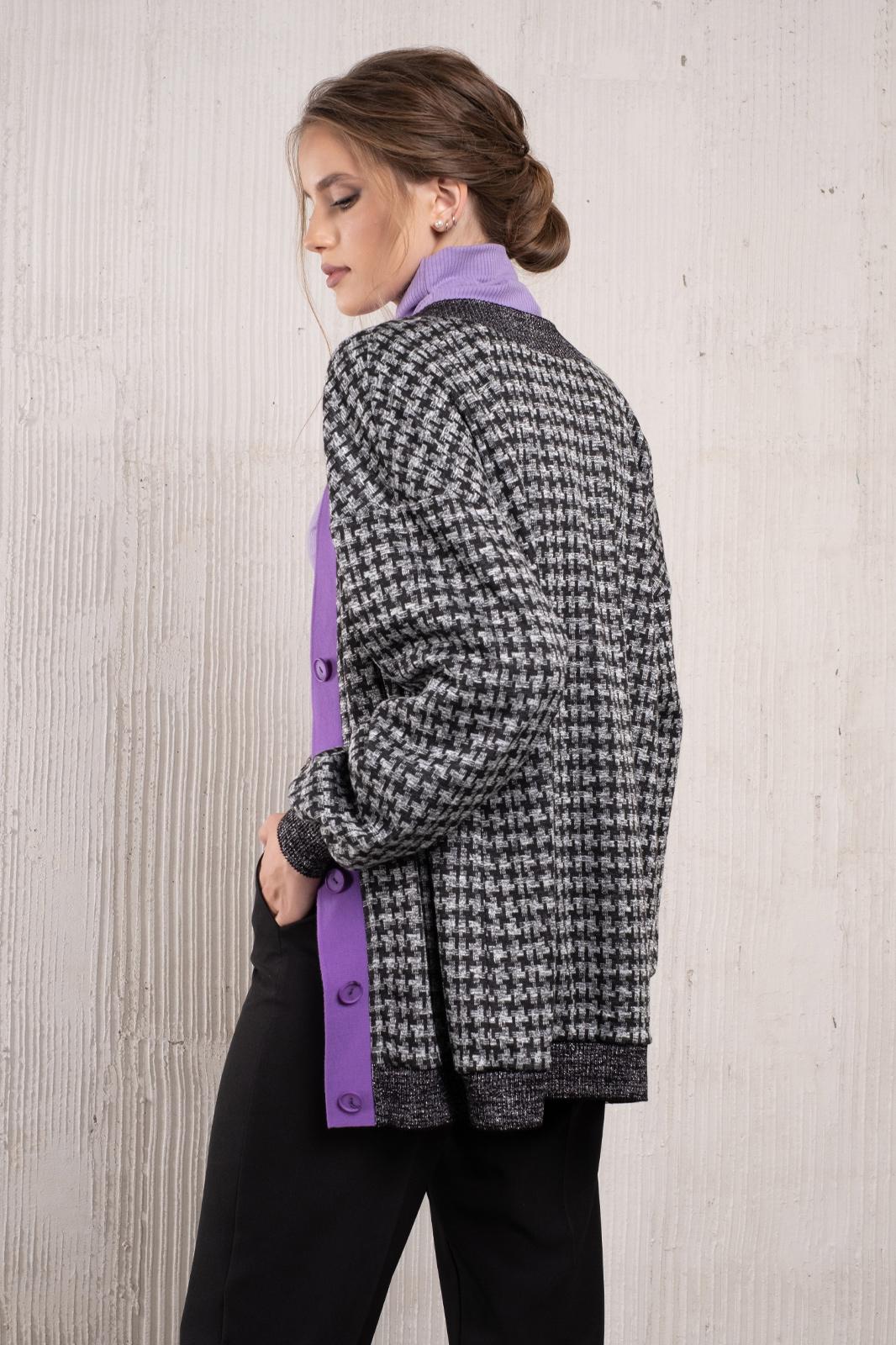 Трикотажный кардиган свободного кроя. Застежка спереди на пуговицы. Длина по спинке 78 см. Рукав втачной на спущенной пройме. Длина рукава полный. Подойдет на рост 164-170 см.