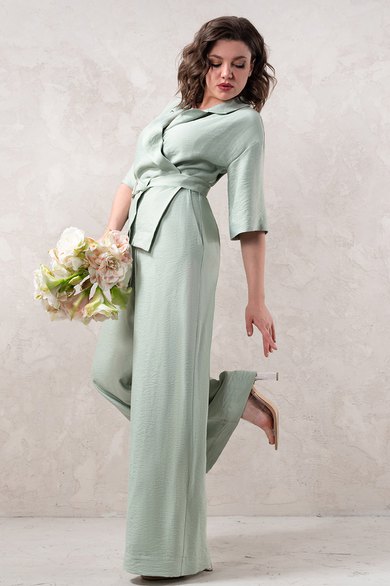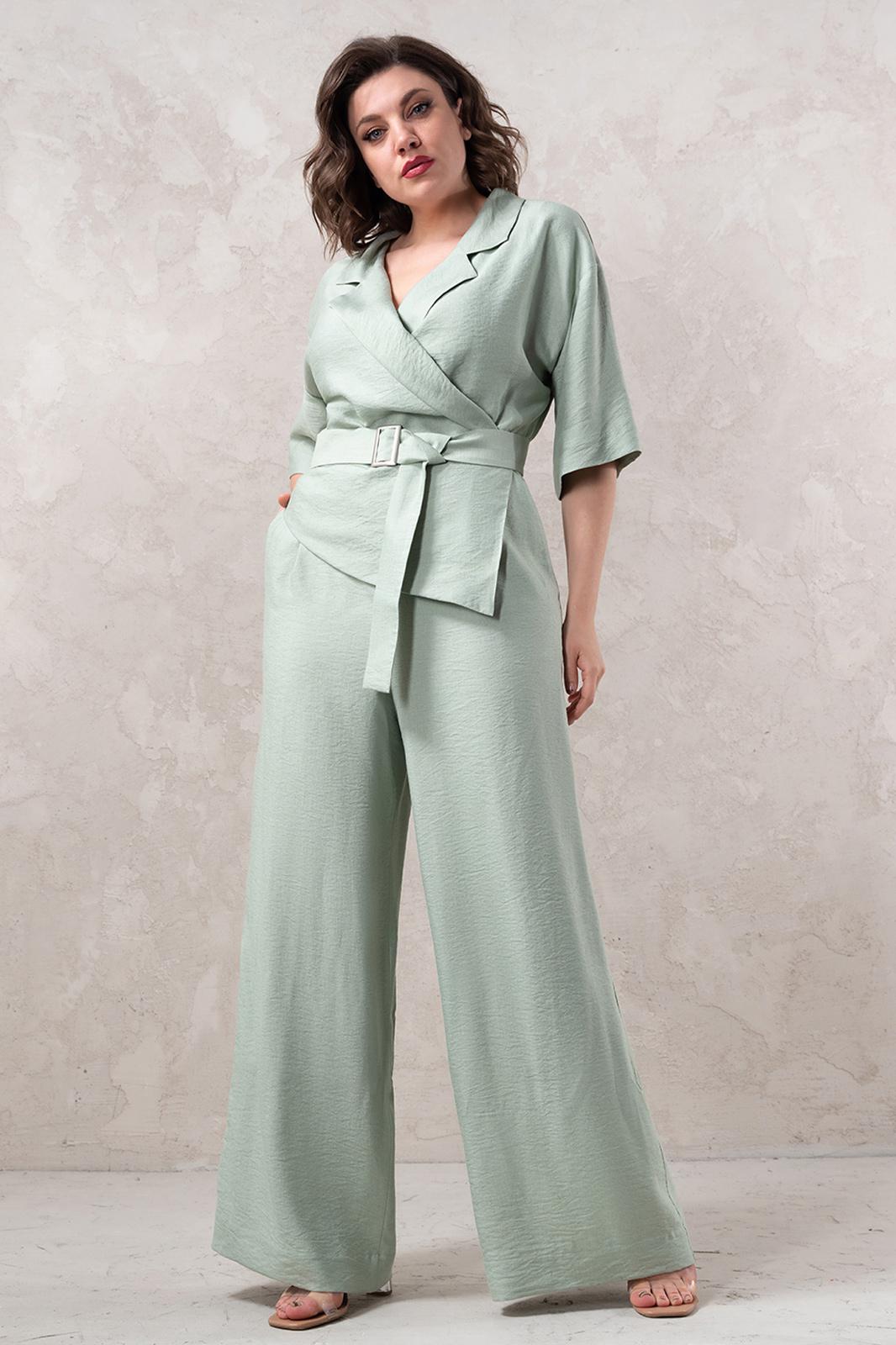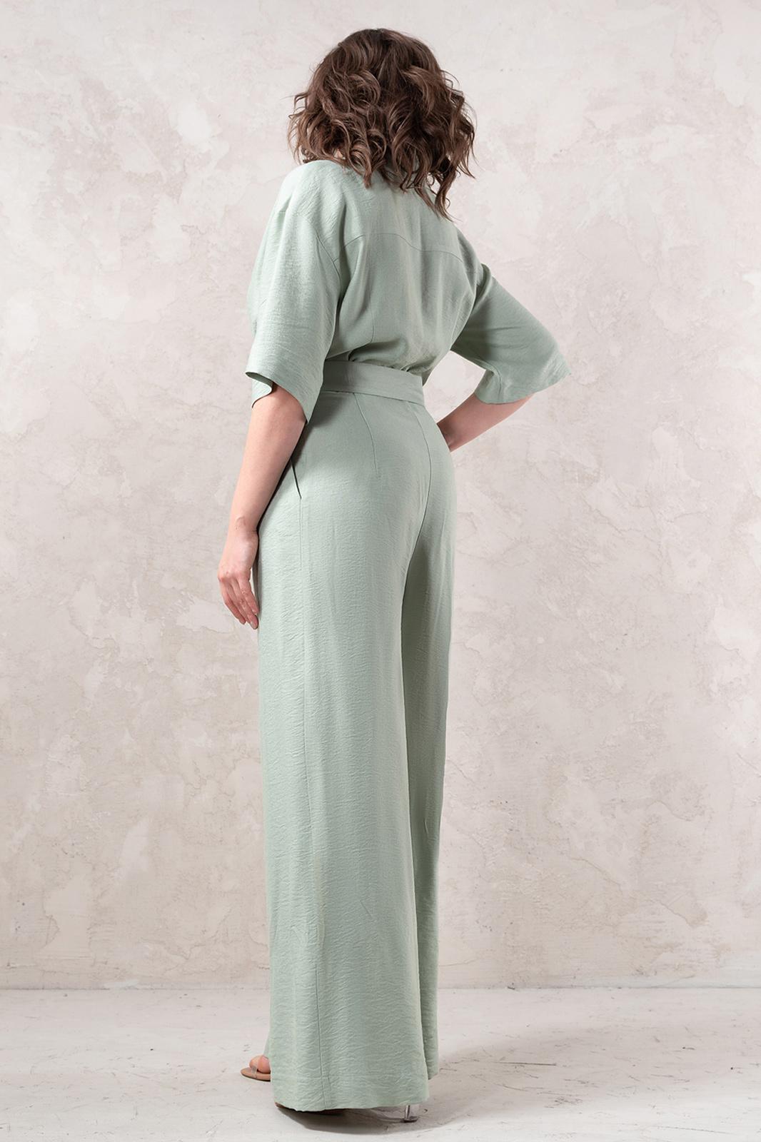 Легкий летний комбинезон из плательно-блузочной ткани средней плотности, немного тянется. Застежка на молнию и кнопки спереди. Воротник пиджачного типа. Брюки прямые, широкие. Длина изделия по спинке 160 см.