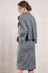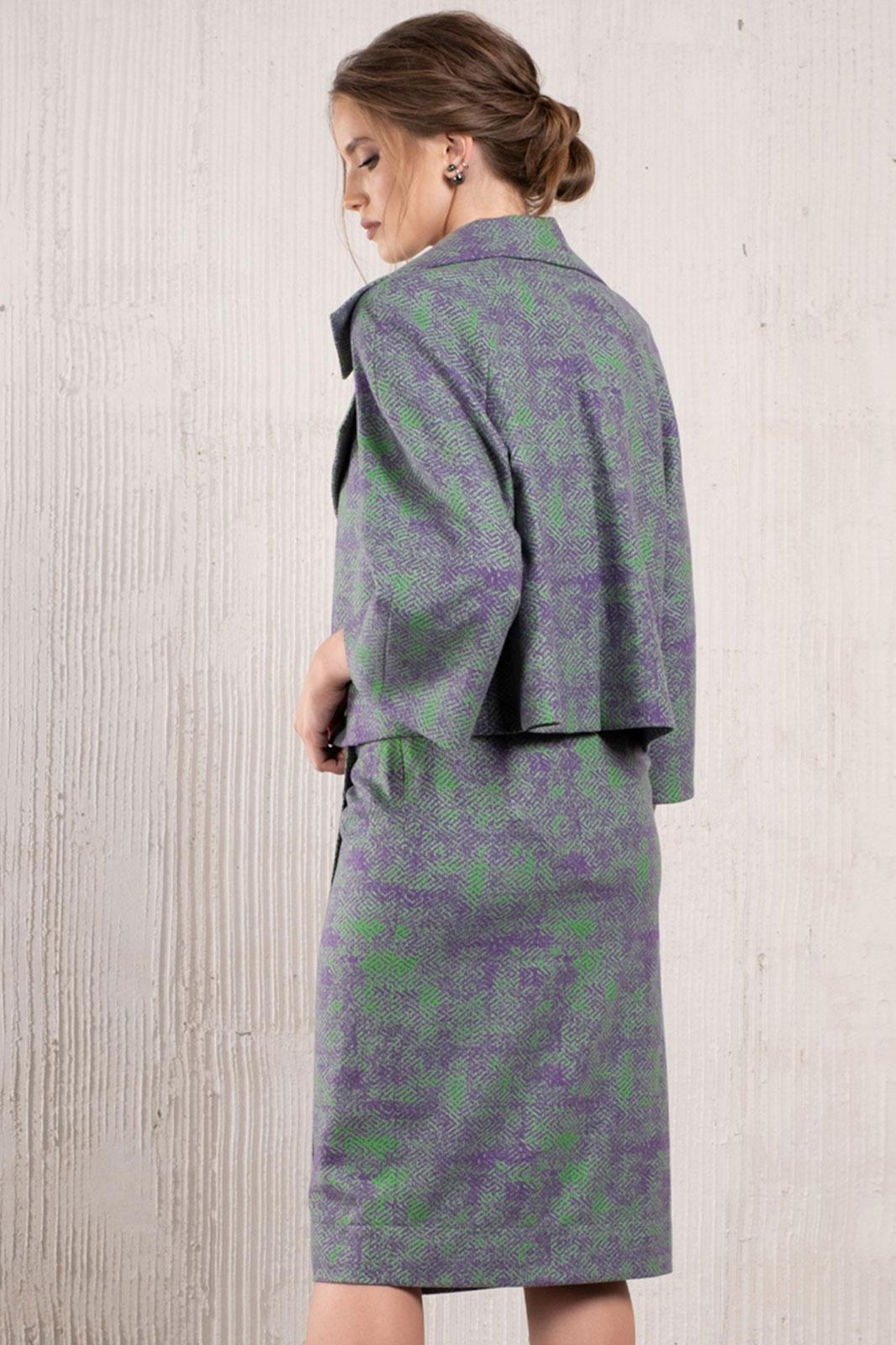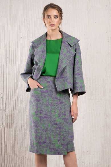 Комплект двойка: жакет+юбка. Ткань костюмно-плательная средней плотности, приятная на ощупь. Жакет укороченный. Изделие на подкладе. Застежка на пуговицы спереди. На спинке шлица. Рукав покроя реглан, длина 3/4. Юбка прямая. Застежка на молнию в боковом шве. На переде шлица и карман. Внутренние швы окантованы. Длина жакета 51 см. Длина юбки 69 см.