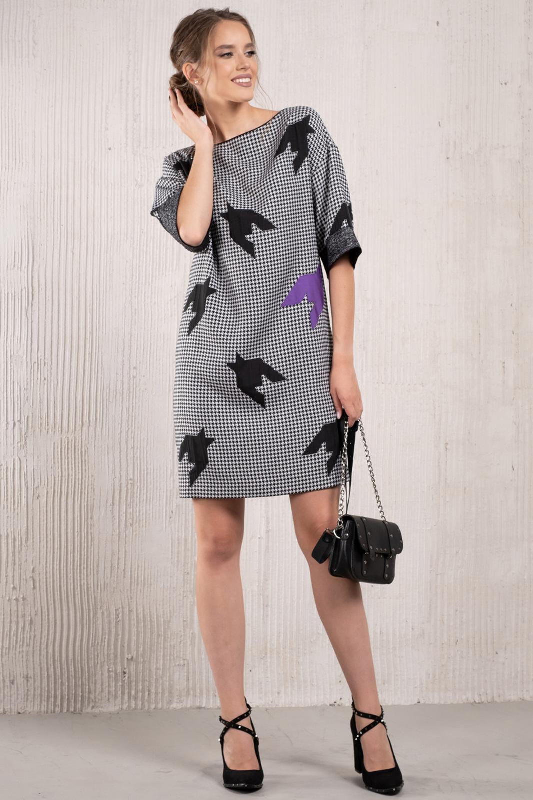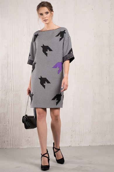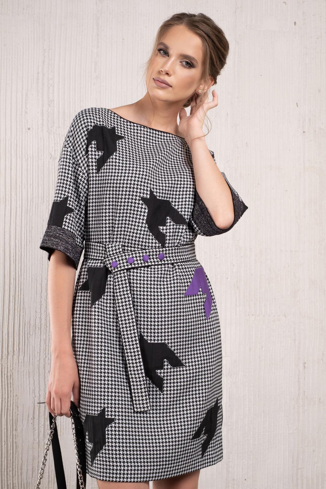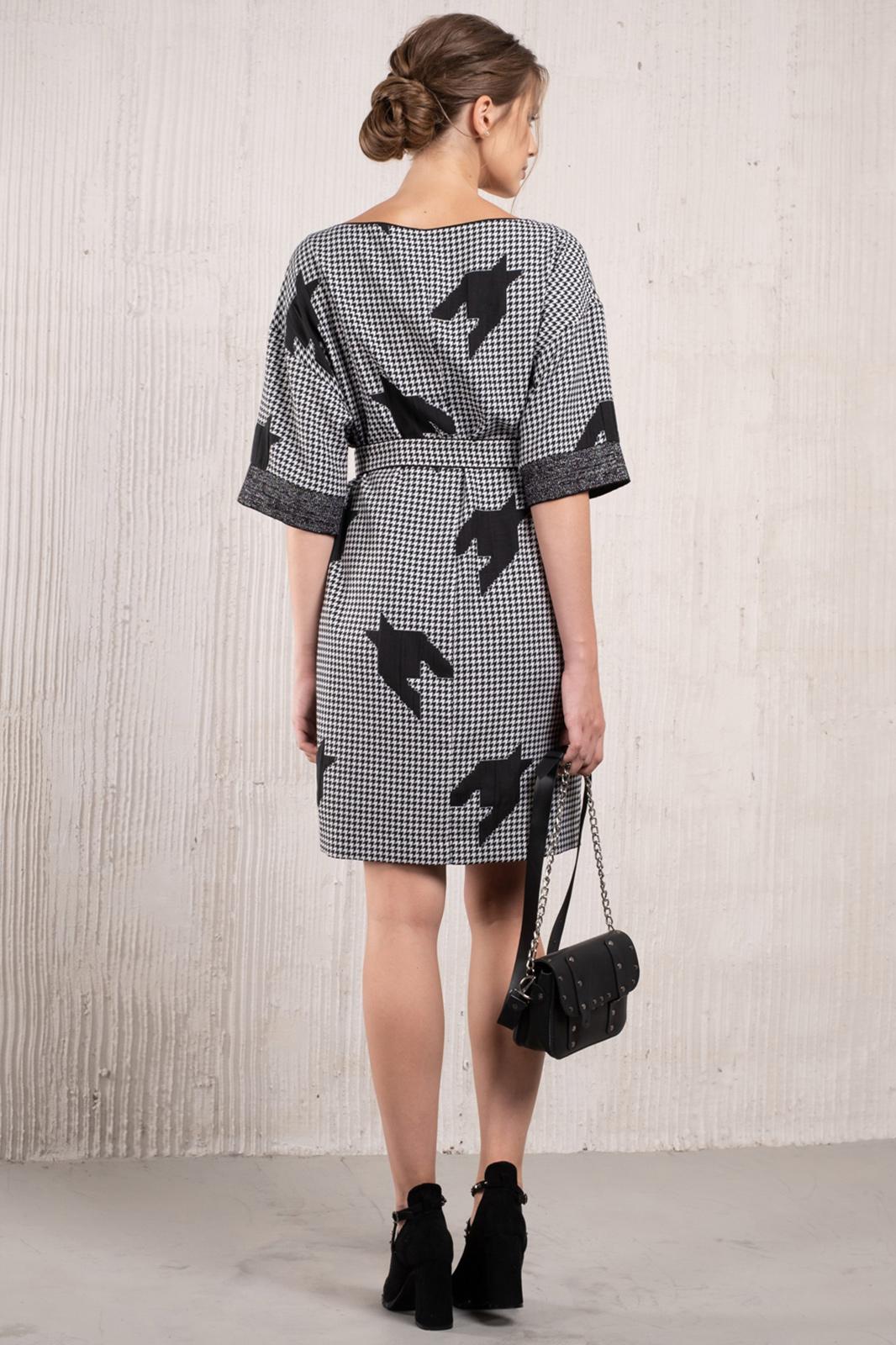 Элегантное платье полуприлегающего силуэта из костюмно-плательной ткани средней плотности. Рукав втачной на спущенной пройме. Низ рукава обработан трикотажной манжетой. Пояс съемный. Длина платья 92 см.