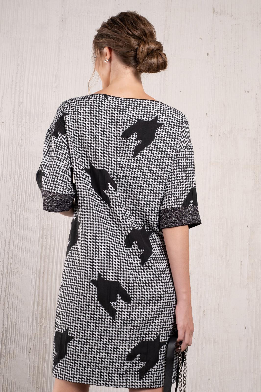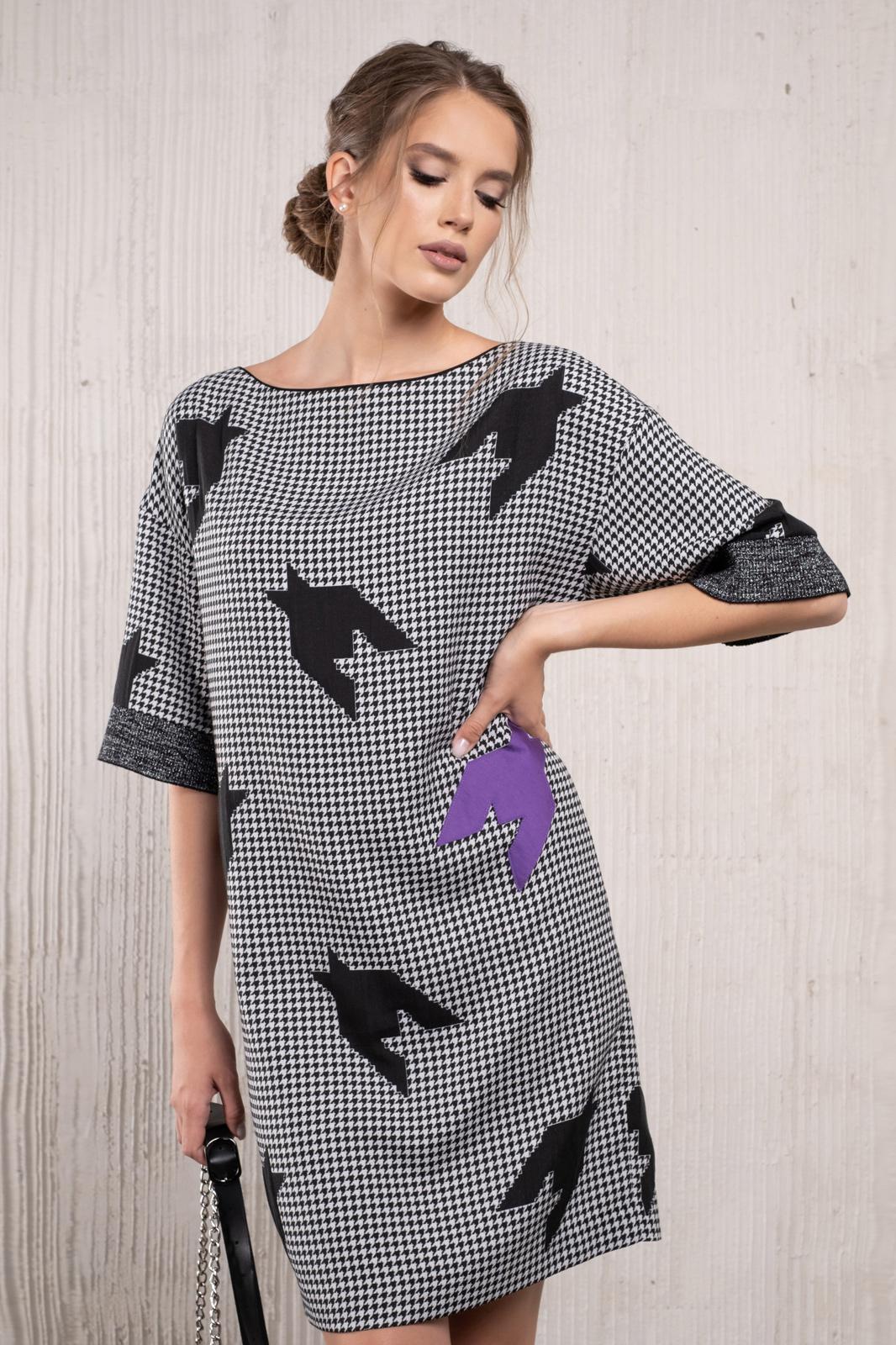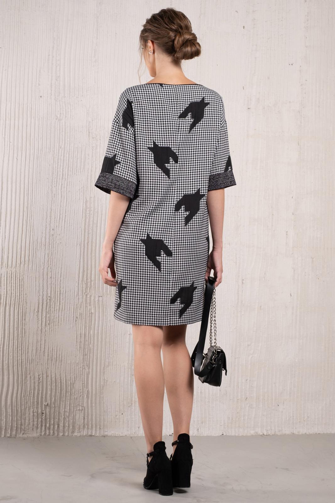 Элегантное платье полуприлегающего силуэта из костюмно-плательной ткани средней плотности. Рукав втачной на спущенной пройме. Низ рукава обработан трикотажной манжетой. Пояс съемный. Длина платья 92 см.