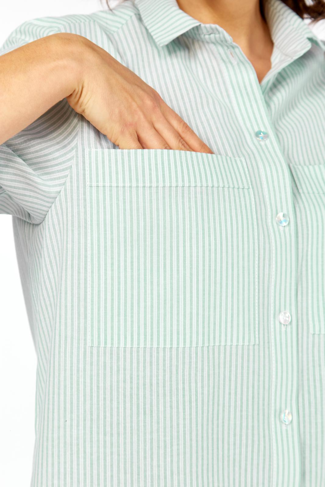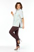 Рубашка свободного кроя, в стиле оверсайз. Силуэт свободный. На переде настрочены 2 кармана. По боковым швам разрезы. Рукав короткий. Плечо спущенное. Боковой сделан на 3см на запах,поэтому разрез не расходится.Длина по спинке-79см, длина рукава-27,5см, длина плеча-17 длина разреза-26см. Параметры модели: обхват груди-98см, обхват бедер-110см, размер топа на модели 50.