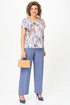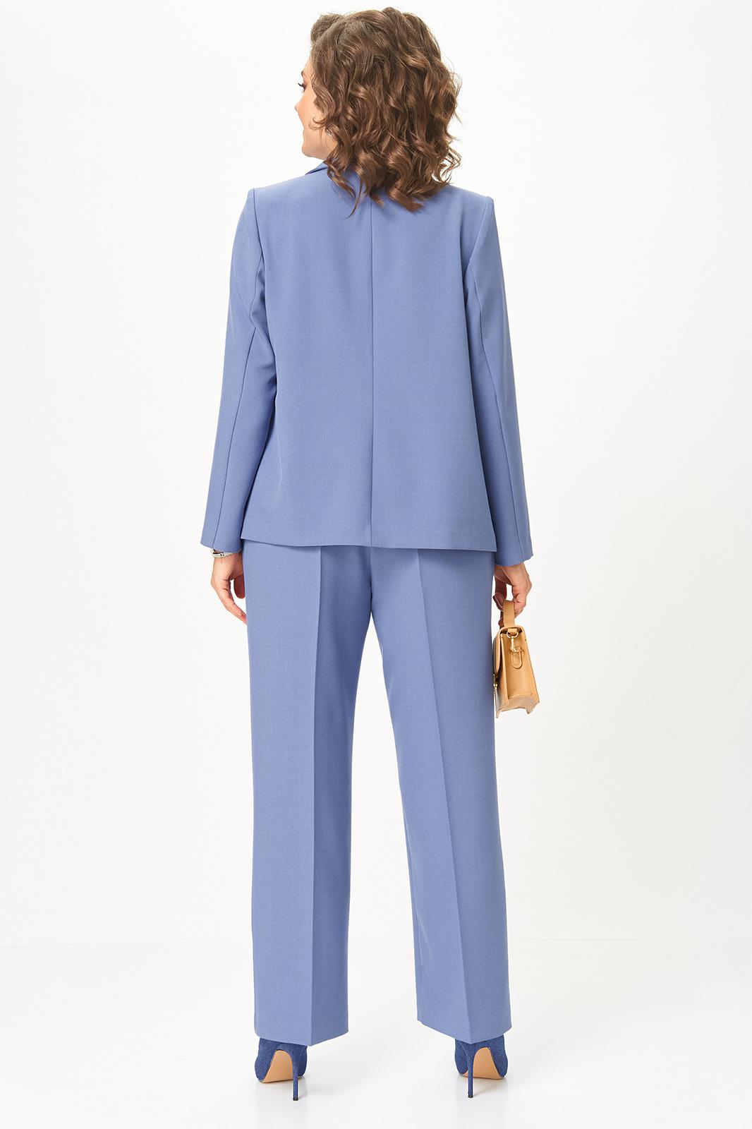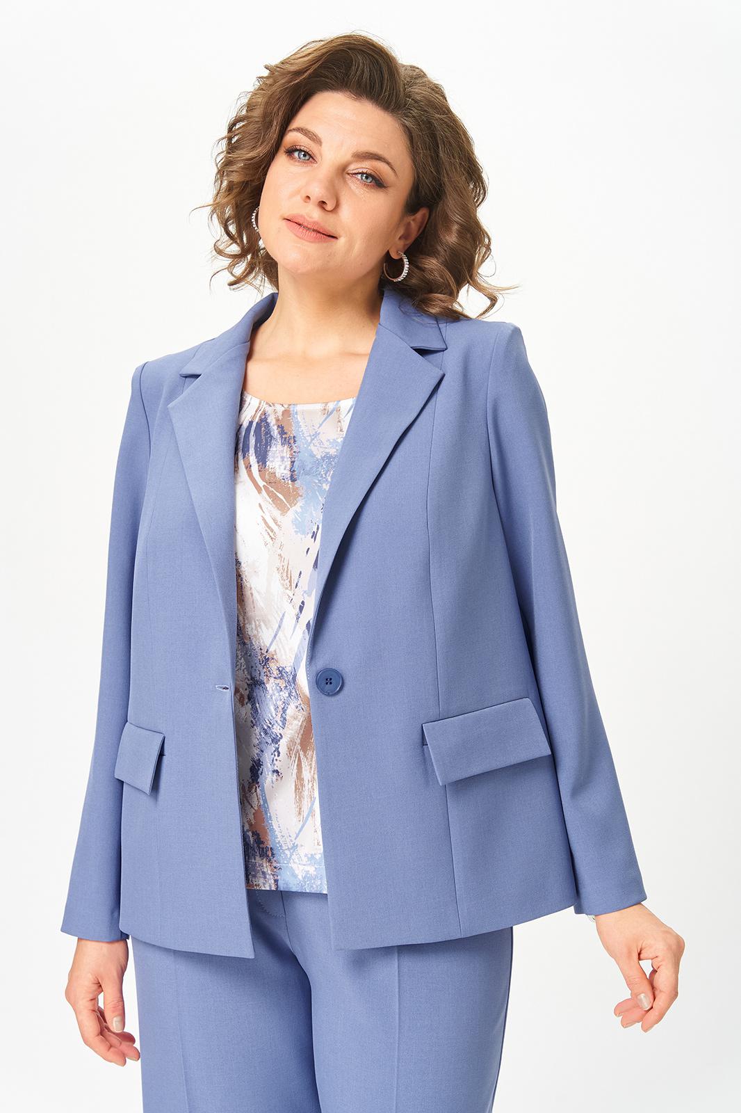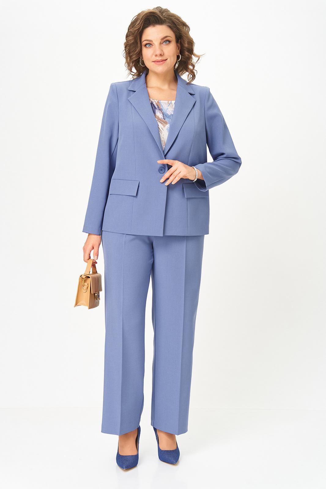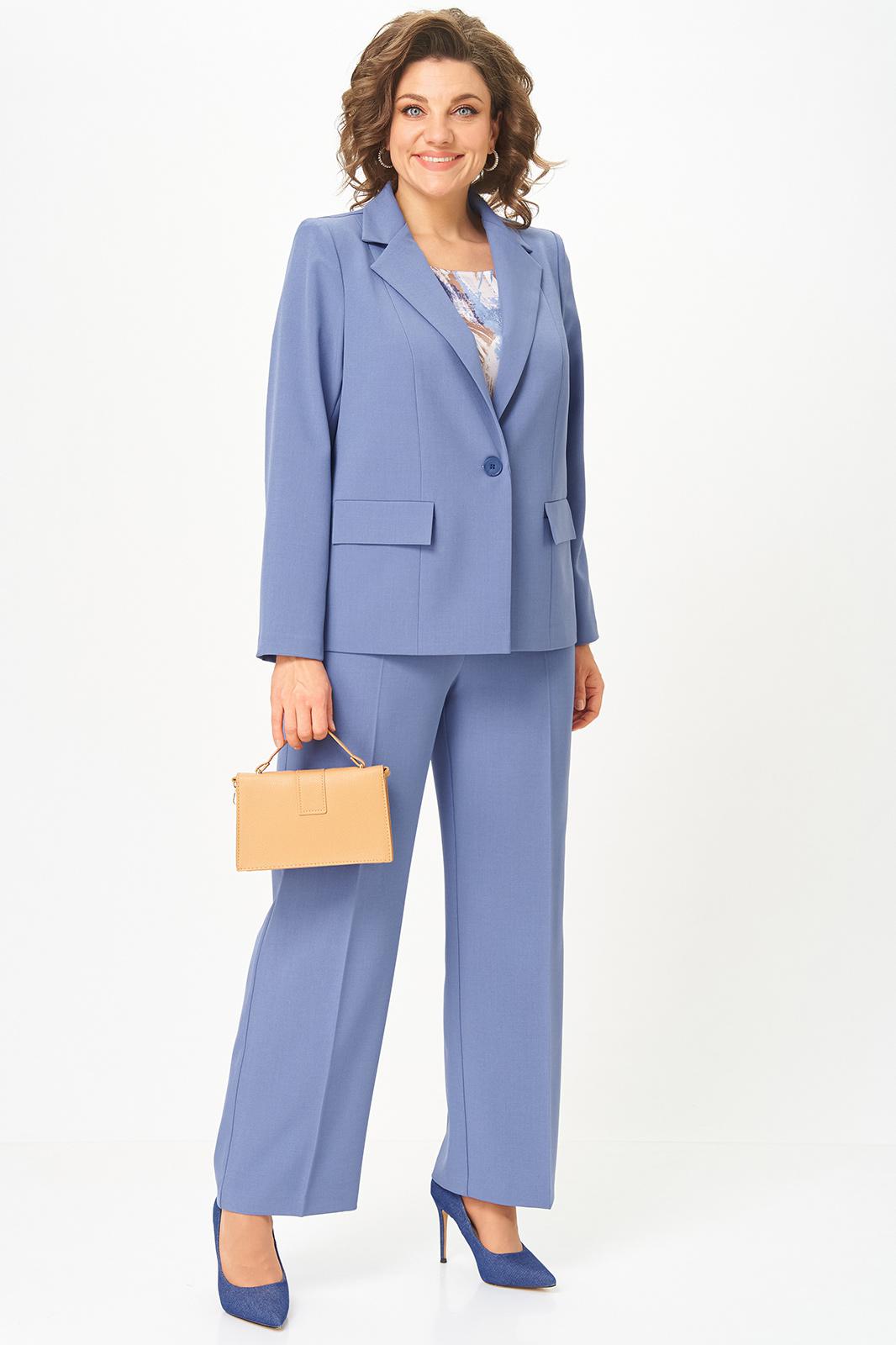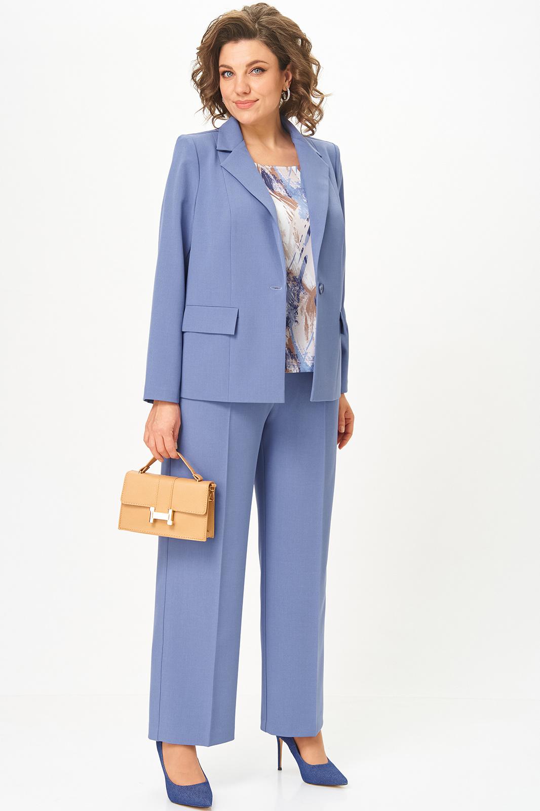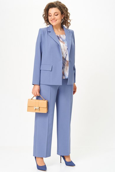 Женский трёхпредметный комплект состоит из жакета и брюк , выполненных из однотонной плательно-костюмной ткани и блузы,выполненной из сатина с оригинальным дизайном.