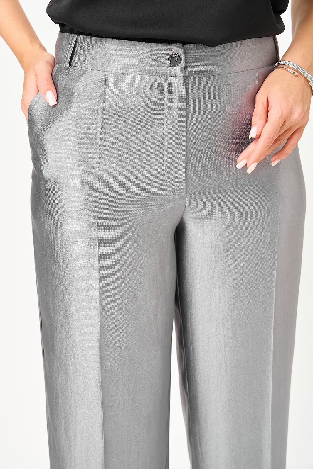 Брюки прямые на притачном поясе и застёжкой на тесьму-молнию и 1 петлю и пуговицу.По переду складки,по спинке талиевые вытачки.Брюки со стрелками.