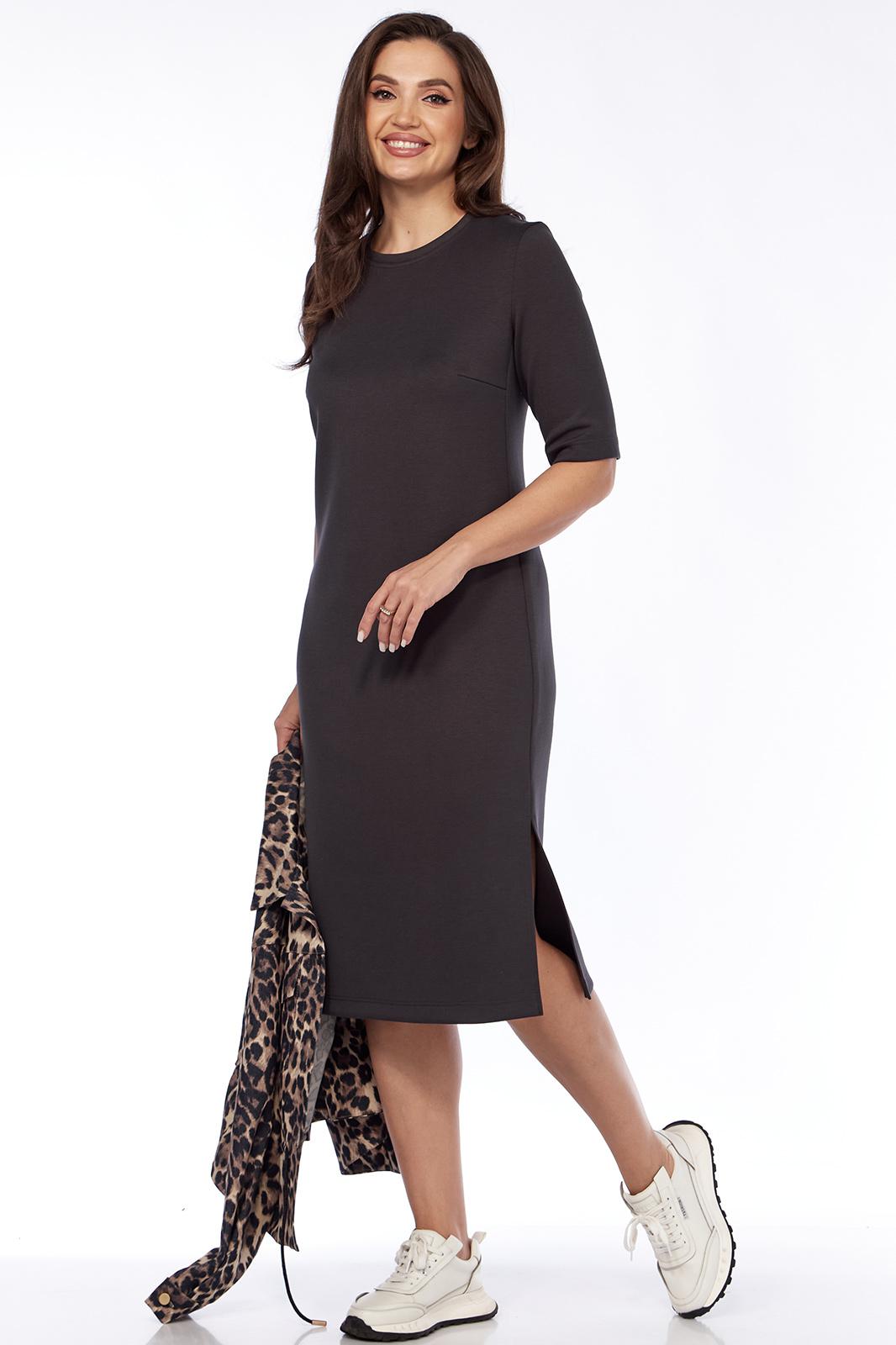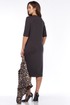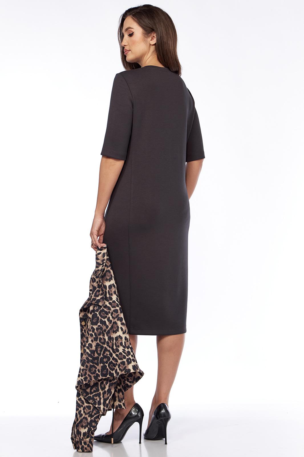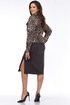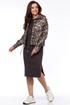Стильный комбинированный женский комплект, состоящий из джинсового жакета в модный принт леопард и трикотажного платья свободного силуэта. Жакет прямого силуэта с центральной застёжкой на петли и пуговицы и кулисой в области талии и декоративным шнуром (для приталивания при желании). Линия плеча слегка спущена. Рукава длинные рубашечного типа на притачной манжете с застёжкой на петлю и пуговицу. Круглый вырез горловины обработан отложным воротником. Перед с отрезной кокеткой и накладными карманами с клапанами и застёжкой на петлю и пуговицу. Спинка цельная. Платье прямого силуэта с рельефами от проймы до низа изделия ,бочки цельные, без боковых швов. По переду нагрудные вытачки и интригующий разрез(слева).