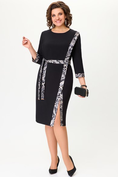 Женское платье полуприлегающего силуэта выполнено из однотонной гладкой плательно-костюмной ткани с отделкой из крепа с анималистическим принтом. Перед с нагрудной вытачкой справа и рельефом от плечевого шва до низа слева, заканчивается разрезом,в шов вставлена планка из декоративной ткани.Спинка со средним швом и талиевыми вытачками. Рукава втачные двухшовные,по низу на притачных манжетах из декоративной ткани.Платье укомплектовано поясом из отделочной ткани с одной стороны и основной ткани с другой,на концах декоративные зажимы