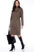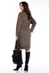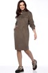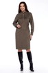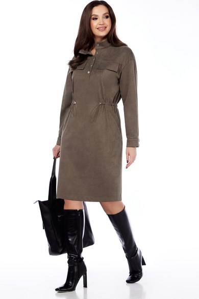 Женское платье прямого силуэта,приталивание достигается за счёт кулисы в области талии, выполнено из трикотажного полотна под вельвет ,длиной до середины колена. Перед с центральной застёжкой на кнопки, отрезными кокетками,в швах клапаны, рельефами от кокетки до боковых швов,в швах карманы с листочками. Спинка с отрезной кокеткой. Плечи спущены.Рукава двухшовные, длинные, низ на притачных манжетах с застёжкой на кнопку. Круглый вырез горловины обработан стойкой.