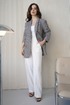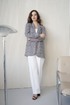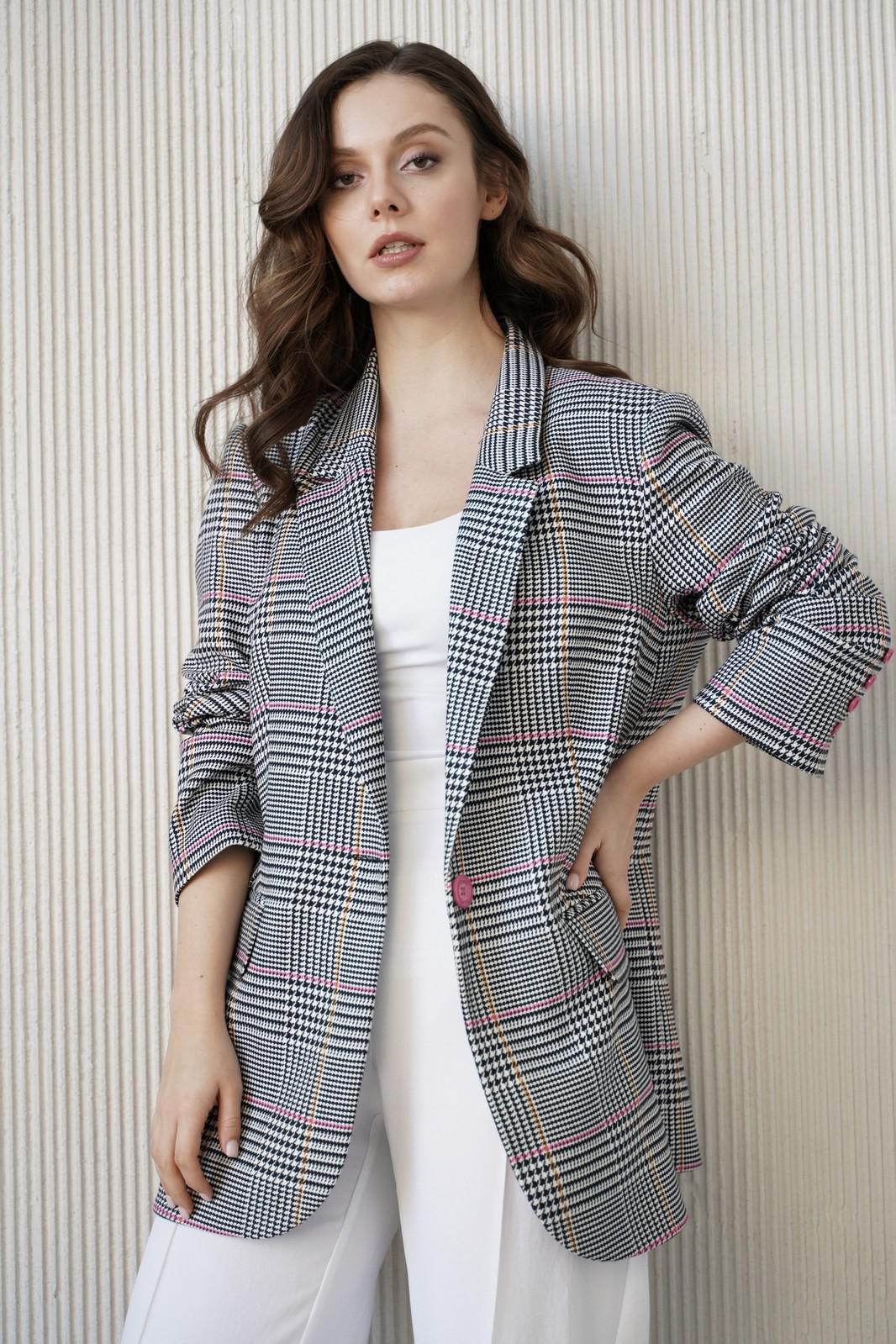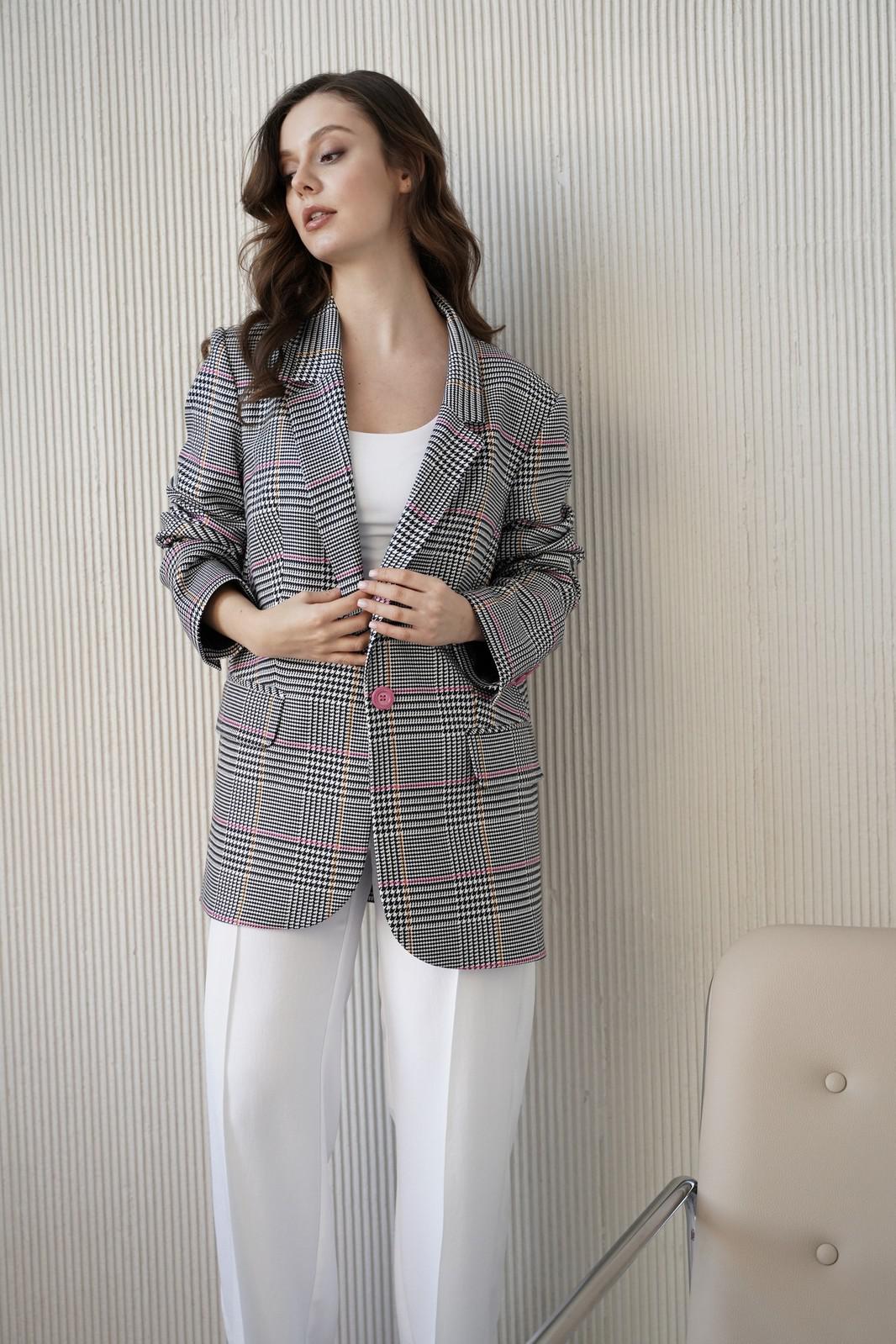 Жакет классического кроя, на подкладке. Застежка центральная по полочке, на одну петлю и пуговицу. Воротник с лацканами. На полочке прорезной функциональный карман с клапаном. Рукав длинный, втачной одношовный, со шлицей по низу..