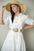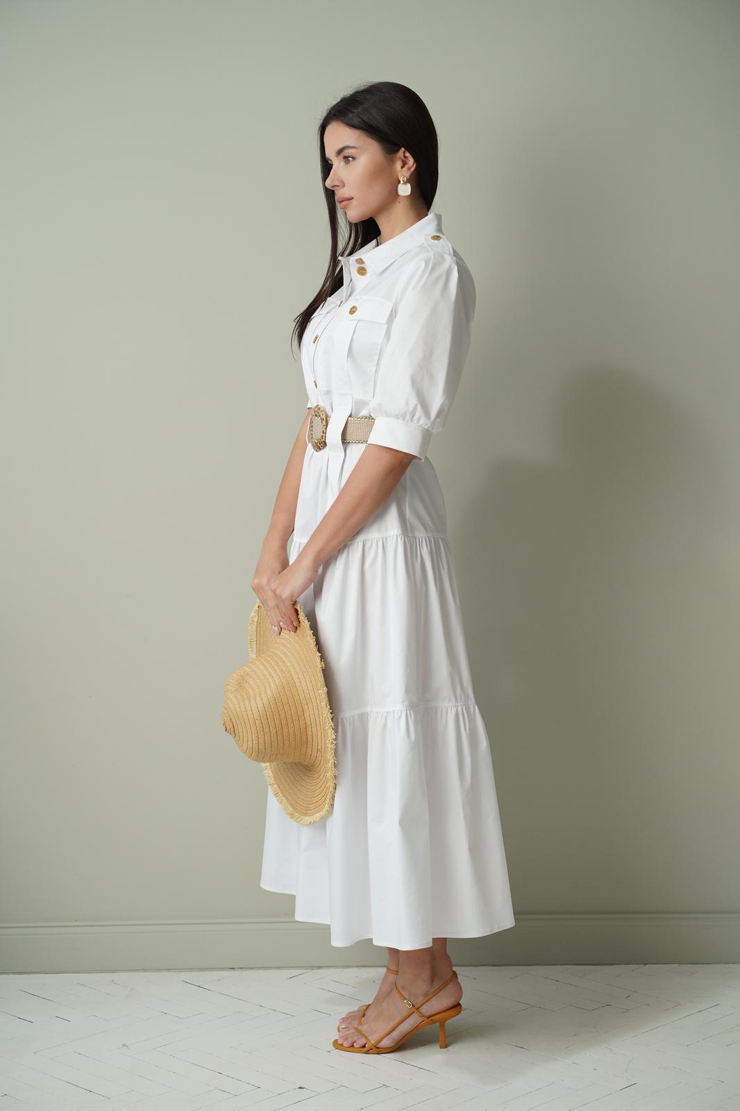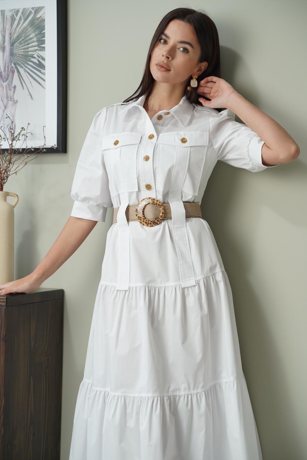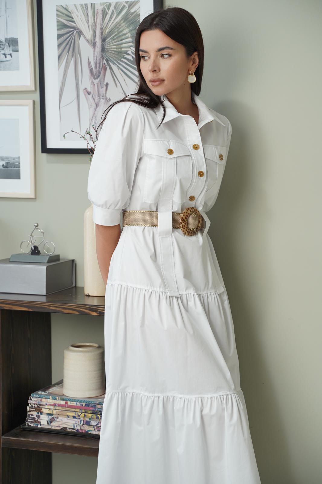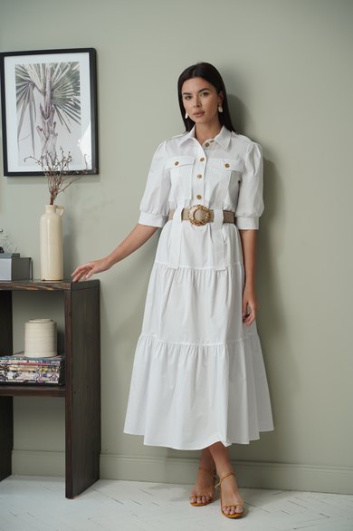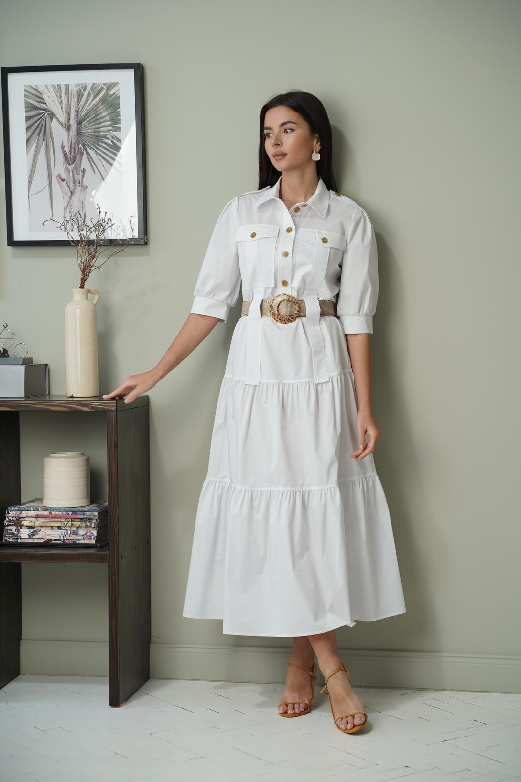 Платье полуприлегающего силуэта, отрезное по линии бёдер. Застёжка центральная до линии талии, с отрезными планками, на петли-пуговицы. Воротник рубашечный с отрезной стойкой. Полочка с накладными карманами с клапаном, застёгивающимся на пуговицы. От верха карман до линии бедра настрочена декоративная деталь шириной 4 см, по линии талии оставлено место для продевания пояса. От линии бедра по полочке и спинке 2 широких волана. Рукав втачной, одношовный, по окату бантовая складка. По плечу пата - погон. Низ рукава присобран, на манжете. Длина рукава до локтя. Длина рукава 36 см. Длина платья по спинке 132 см. Платье без подкладки. Пояс не входит в комплектацию!