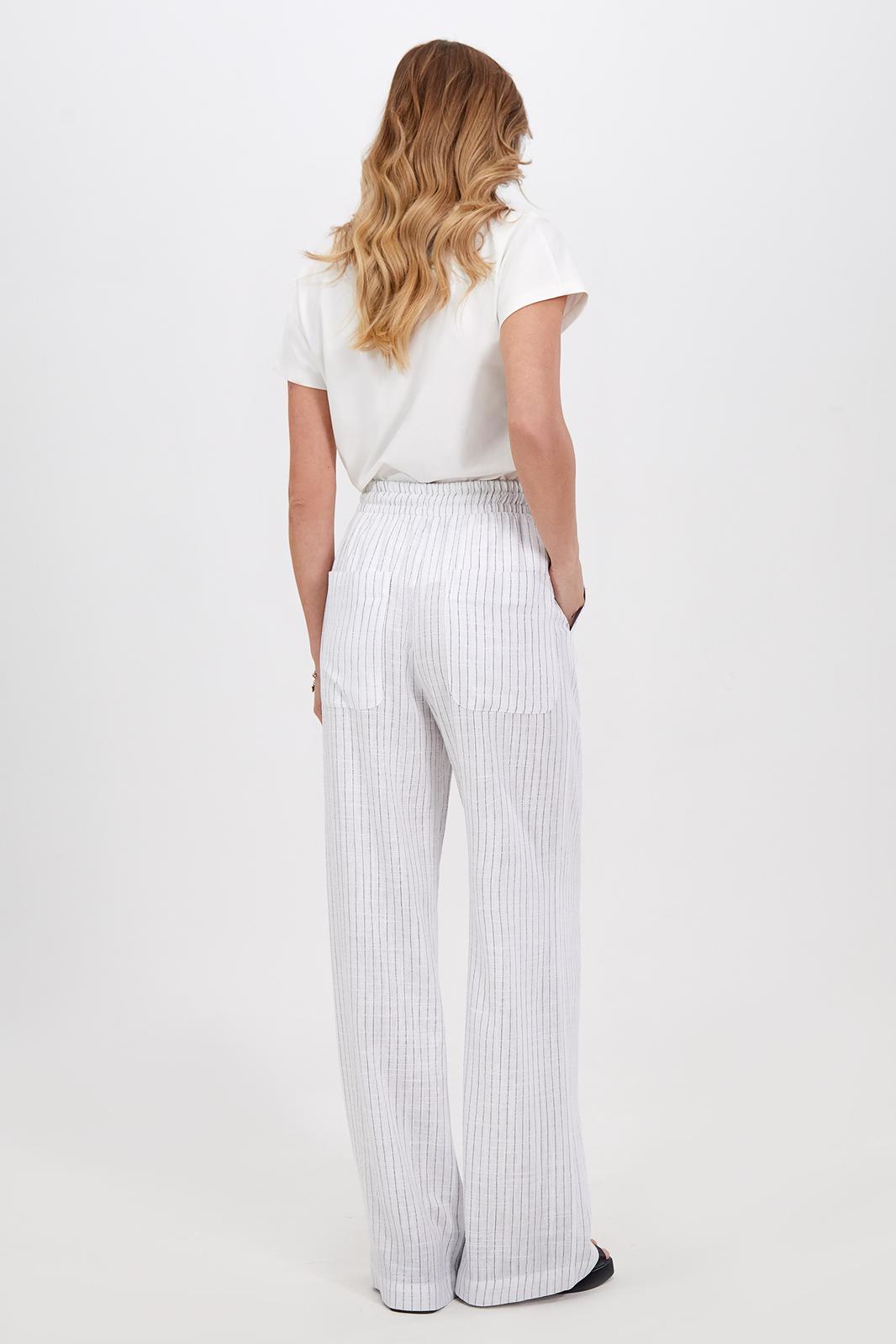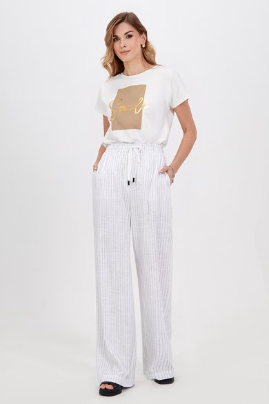 Тонкая смесь льна и вискозы придаёт модели воздушное летнее настроение. Широкий крой и удлинённые штанины придают образу непринуждённый вид. Боковые карманы дополняют повседневный стиль. Эластичный пояс на обычной высоте. Благодаря шнурку его можно регулировать индивидуально