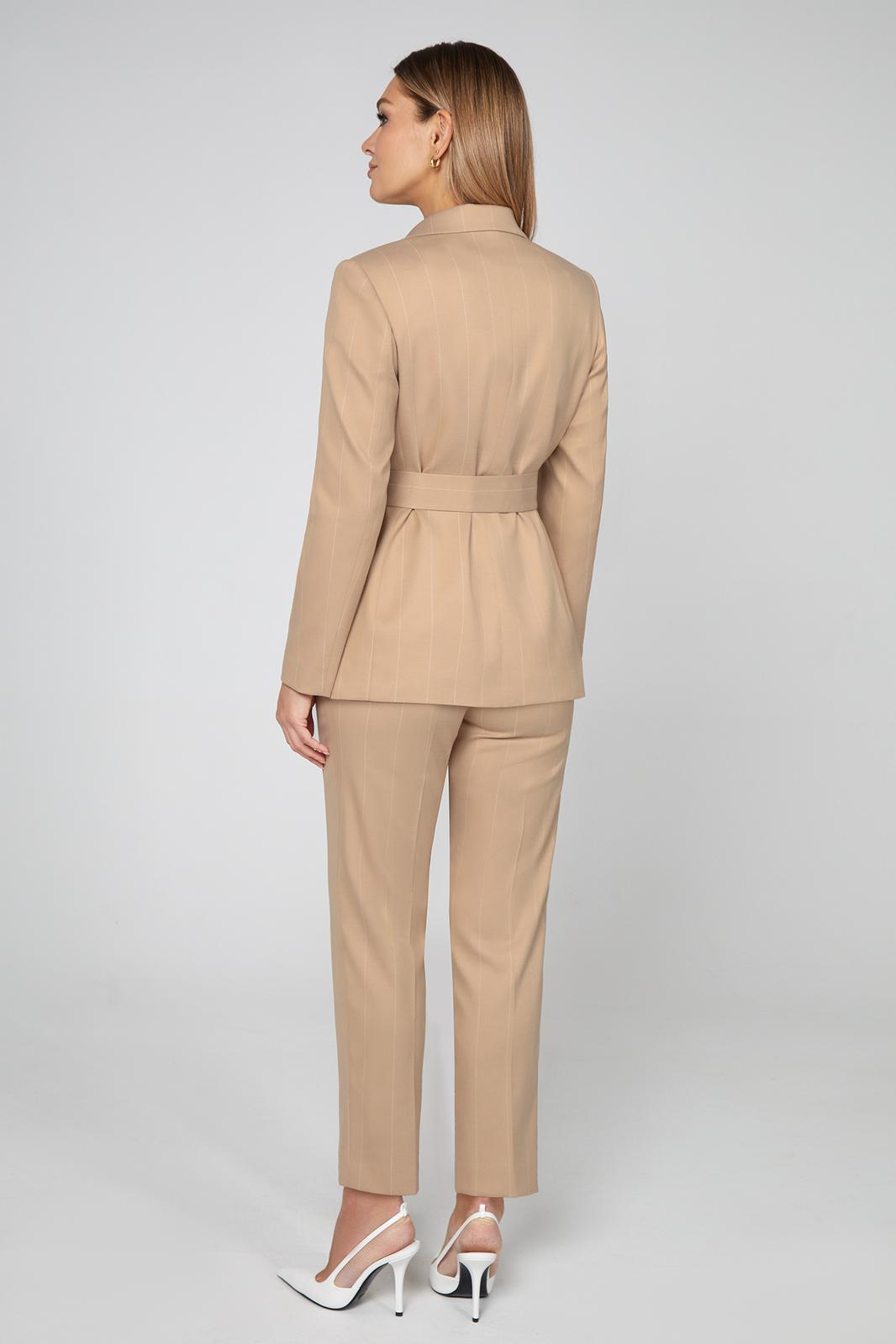 Жакет полуприлегающего силуэта с застёжкой на петлю-пуговицу станет отличным решением для офисного гардероба. Приятная ткань в полоску с добавлением вискозы прекрасно держит форму, геометричные лацканы добавляют образу элегантности и строгости, карманы с клапанами- функциональности, а отделочные шлицы с пуговицами добавляют модели индивидуальности. Рукава втачные двухшовные. Средняя длина дарит возможность создавать с этим жакетом многообразные комплекты. Широкий пояс в тон позволяет сделать акцент на линии талии, подчеркивая ваше изящество. На подкладке.