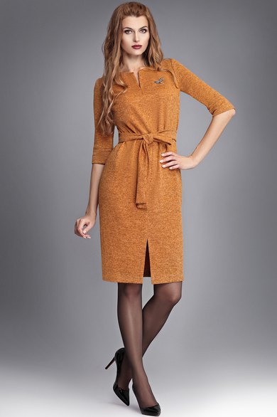 Трикотажное платье полуприталенного силуэта без подкладки с поясом, выполненным из основной ткани. Спереди разрез. Длина платья 104 см. Длина рукава 41 см.