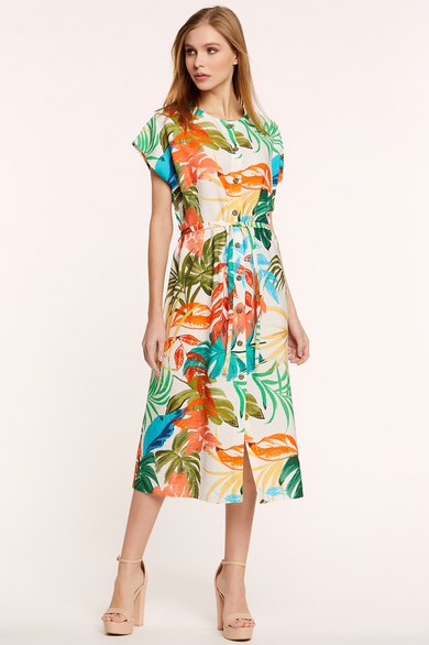 - платье-миди свободного покроя, с округлым вырезом горловины, с центральной застёжкой по переду на петли и пуговицы, с цельнокроеными рукавами, линия талии красиво подчёркнута поясом из основной ткани