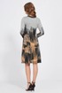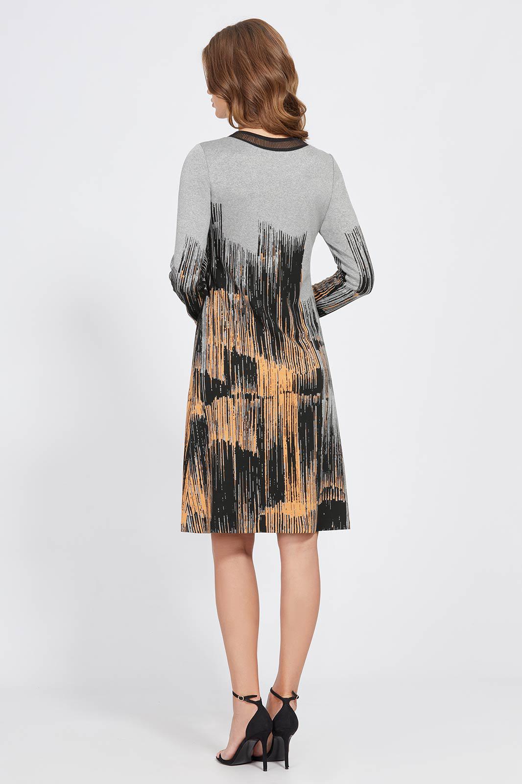 Платье А-образного силуэта с длинными втачными рукавами не только эффективно смотрится, благодаря интересному абстрактному дизайну, но и не уступает в вопросах комфорта, так как сшито из мягкого приятного к телу трикотажа с добавлением вискозы. Горловина изделия обработана отделочной трикотажной тесьмой. Платье будет уместно смотреться как в офисе с нестрогим дресс-кодом, так и прекрасно подойдёт для светского мероприятия.