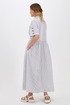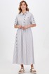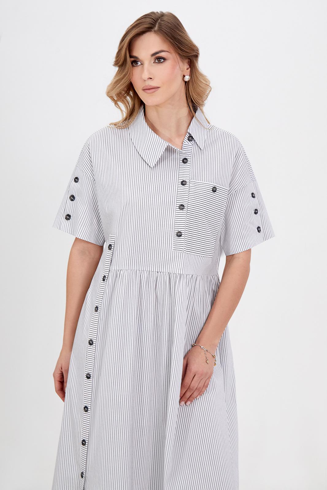 Стильное платье с интересным решением размещения планок и игрой полоски идеально впишется в городские образы в стиле кэжуал. Легкий смесовый материал на основе хлопка приятен для кожи и красиво струится во время носки. Модель свободного кроя с оборкой, с застёжкой на петли-пуговицы, ассиметричным отложным воротником с отрезной стойкой, со спущенной линией плеч с притачными рукавами с застёжкой на пуговицы, с отделочным накладным карманом и функциональными карманами в боковых швах. Длина позволяет носить платье с обувью как на каблуке, так и на плоском ходу.