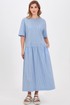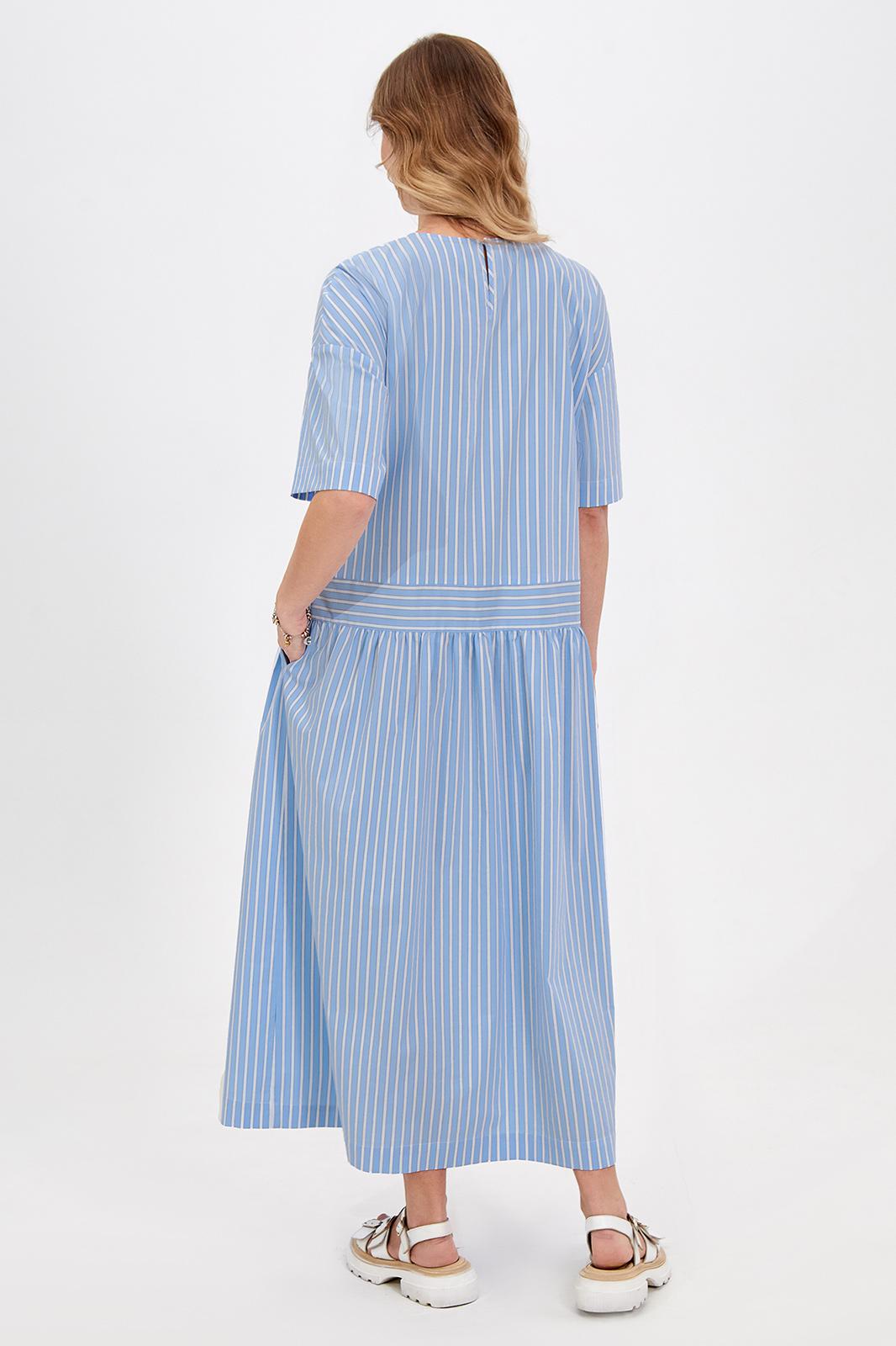 Это платье свободного кроя оптимально подойдет для создания комфортных и стильных кэжуал образов. Материал с высоким содержанием хлопка отлично пропускает воздух и приятен для кожи. Модель с округлой формой горловины со щелевидной застёжкой по спинке на навесную петлю и потайную пуговицу, со спущенной линией плеч с притачными рукавами, фигурным отделочным карманом и функциональными карманами в боковых швах. Акцентным решением стала игра полоски, добавляющая модели больше динамики. Длина позволяет носить платье с обувью как на каблуке, так и на плоском ходу.