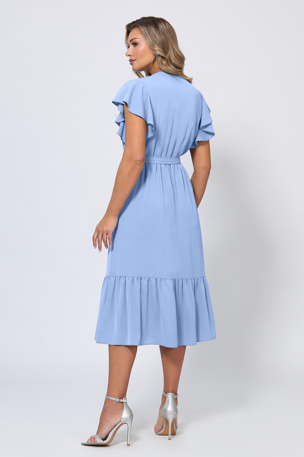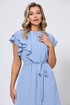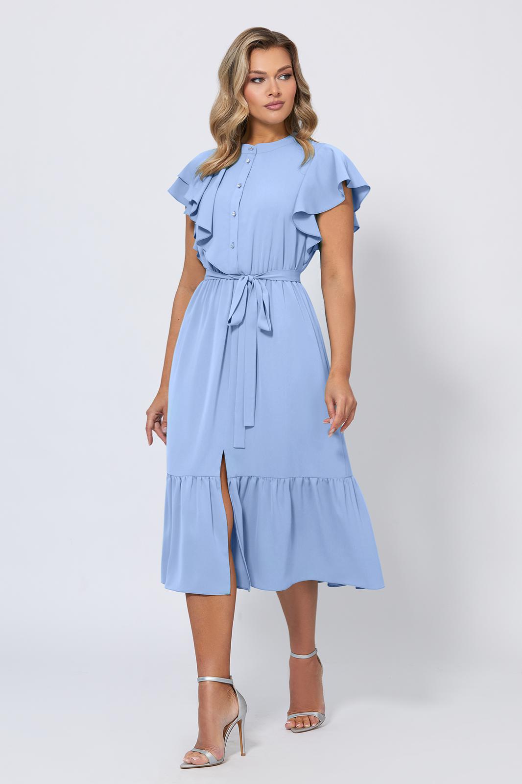 Это женственное платье X-образного силуэта длины миди с интересными деталями - стильное заявление для особых моментов. Нежный цвет и приятная к телу немнущаяся ткань придают модели элегантный вид. Красивая отделка оборками и жабо добавляет выразительности, а разрез по переду красиво смотрится во время движения. Ювелирные пуговицы по планке спереди несут не только функциональный характер, но и добавляют изысканности образу. Скрытая резинка на талии обеспечивает удобную посадку. Тонкий поясок можно завязать бантом, который станет ещё одним украшением платья.
