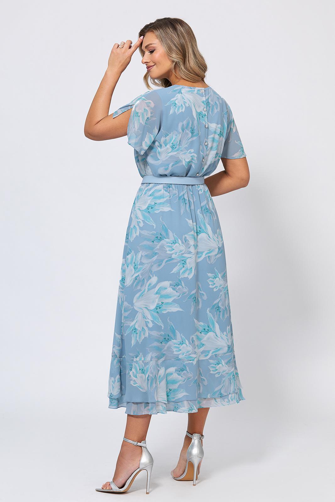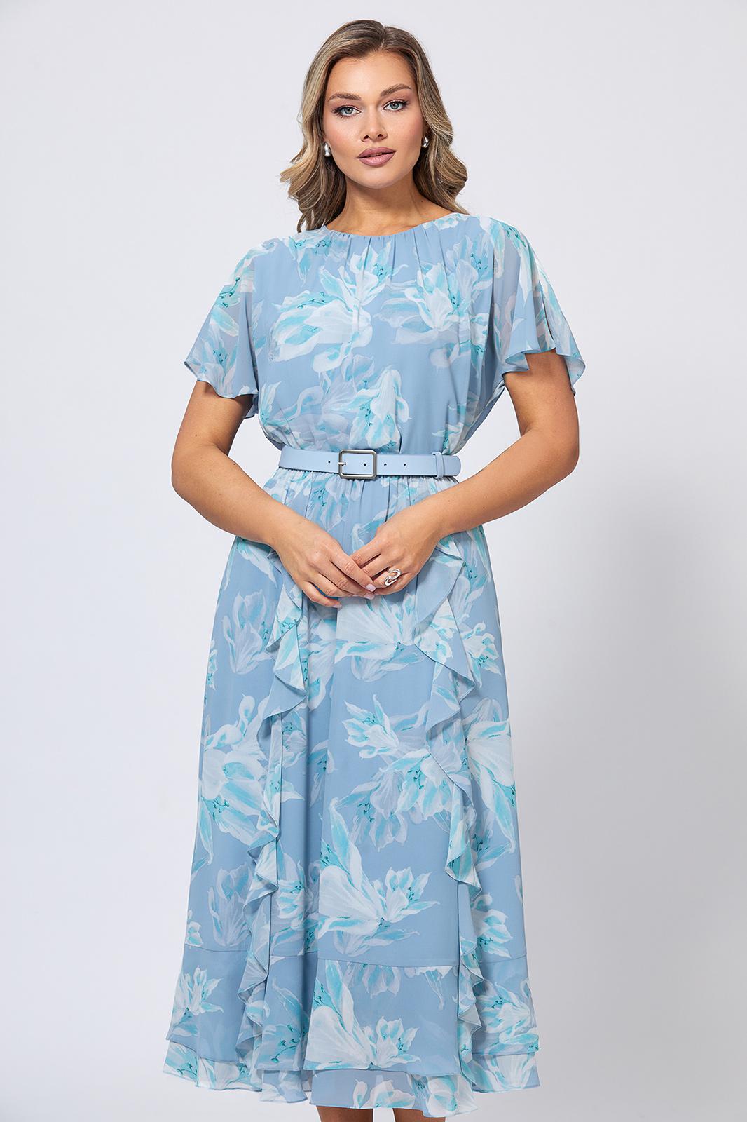 Нарядный летний вариант, идеально подходящий как для вечерних мероприятий, так и для дневных прогулок. Легкая ткань обеспечивает комфорт даже в самые жаркие дни, а универсальный дизайн позволяет комбинировать модель с различными вариантами обуви и аксессуаров. Платье отрезное по линии талии, со скрытой резинкой, обеспечивающей удобную посадку. Воланы по переду и низу юбки подчеркивают романтичный стиль, а цельнокроеные рукава превращаются в изящные крылышки, добавляя образу нотки нежности и воздушности. Модель с круглой формой горловины, со сборкой по переду и застёжкой на петли и отделочные пуговицы по спинке. Лиф платья и расклешенная юбка продублированы подкладкой из 100% вискозы. Линия талии красиво подчёркнута поясом-ремнём с пряжкой