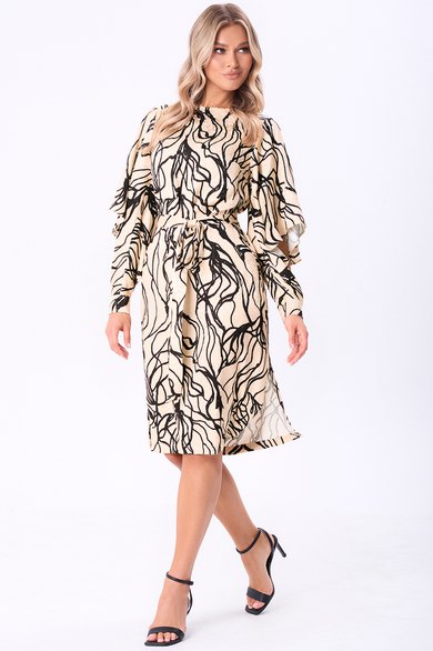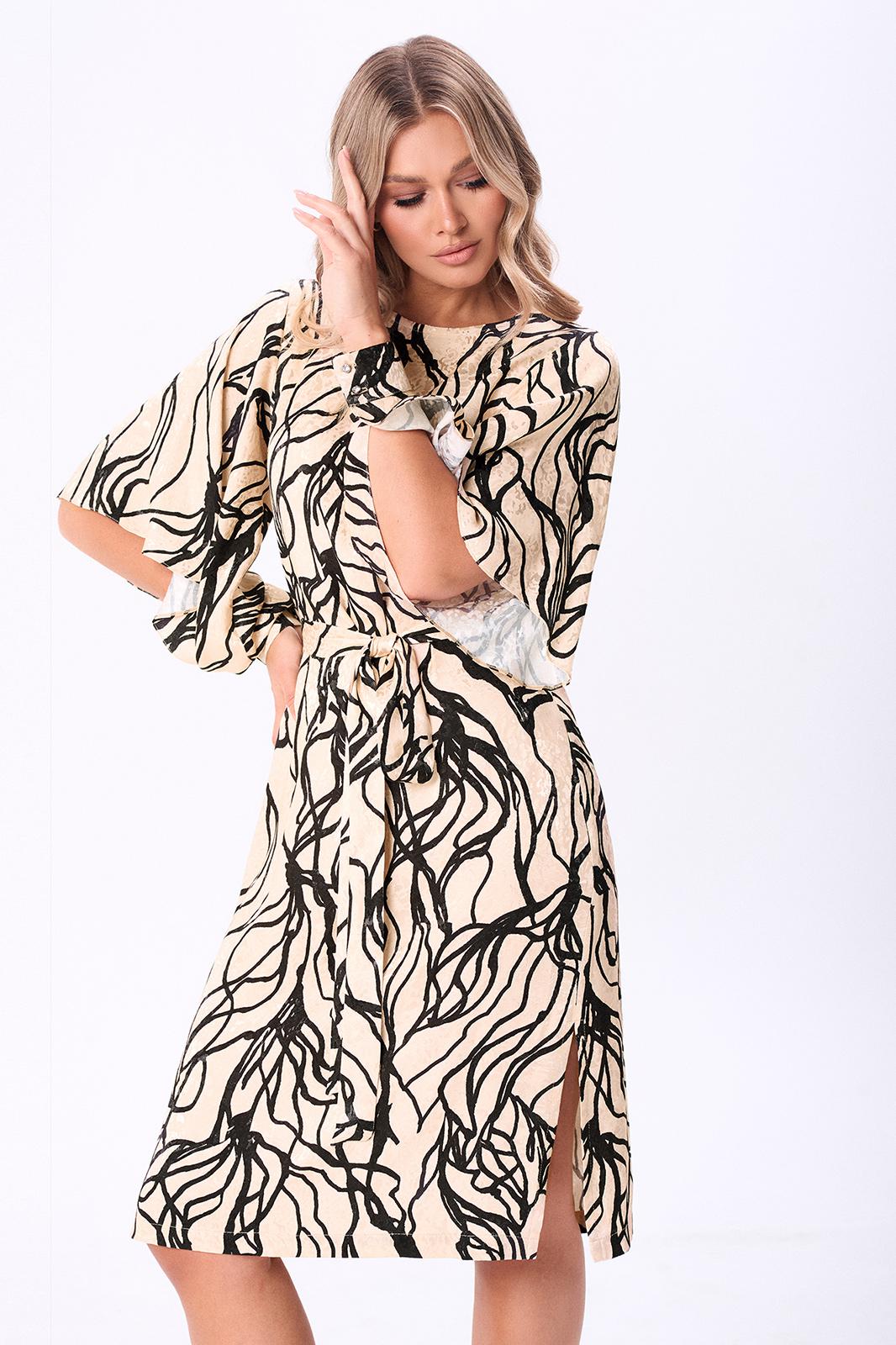 Данная модель платья прямого силуэта длины миди - эталон женственного образа. Правильное настроение задали при помощи абстрактного цветочного принта и достойного внимания кроя рукавов, частично приоткрывающих руки и задающих романтическое настроение, и манжет с красивыми ювелирными пуговицами. Динамичность модели придают разрезы в боковых швах. Для удобства в носке по спинке обработана застёжка-капля на петлю-пуговицу. Сформировать приталенный силуэт помогает пояс-ремень с пряжкой. Платье выполнили из приятной вискозной ткани с интересным сочетанием матовой основы и ненавязчивых атласных крапинок. Оно идеально подходящей для торжественных и праздничных мероприятий и вечерних выходов.