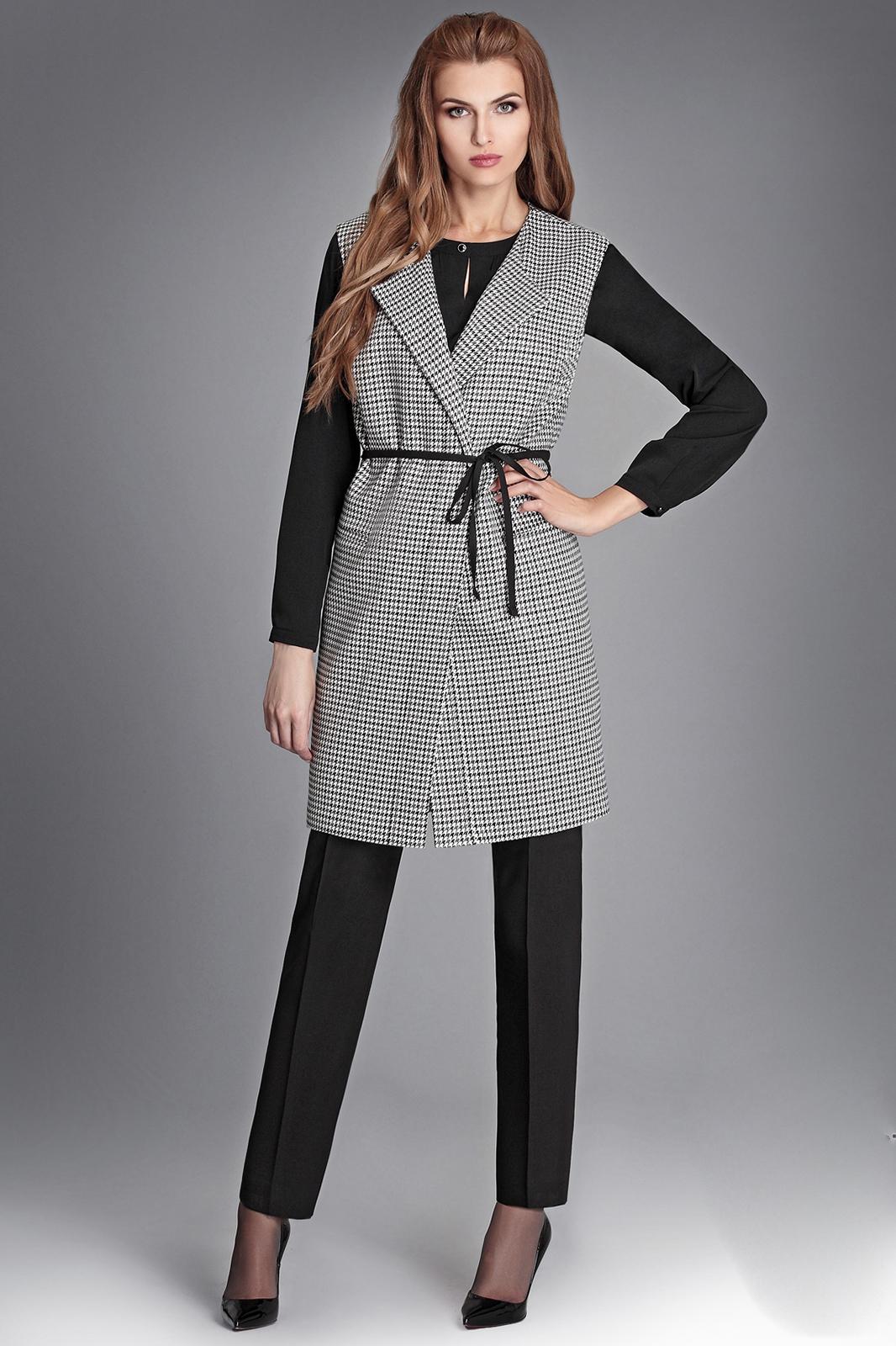 Жилет двубортный, на подкладке, с застежкой на потайные пуговицы. Длина изделия 98 см.
