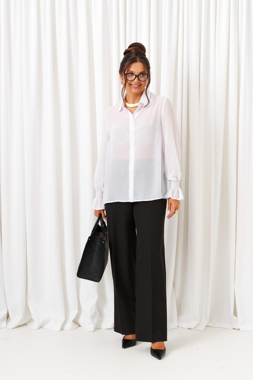 Блузка рубашечного типа выполнена из легкой, струящейся шифоновой ткани.
