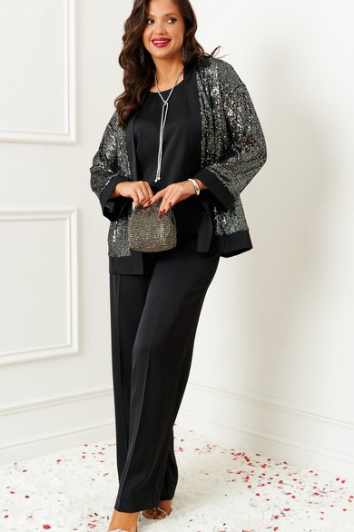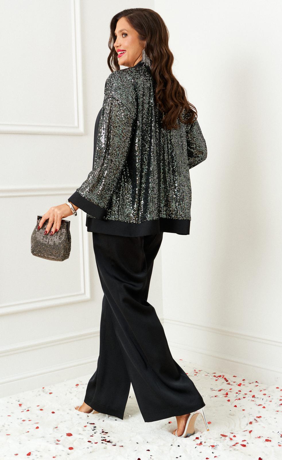 Брючный комплект в комбинации сияющего роскошного атласа с эксклюзивным полотном с пайетками не останется незаметным в главную новогоднюю ночь!