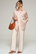 Брюки длинные, прямые свободные; выполнены из смесового льняного полотна. Посадка классическая, высокая. Застежка центральная на молнию и петлю с пуговицей на поясе.