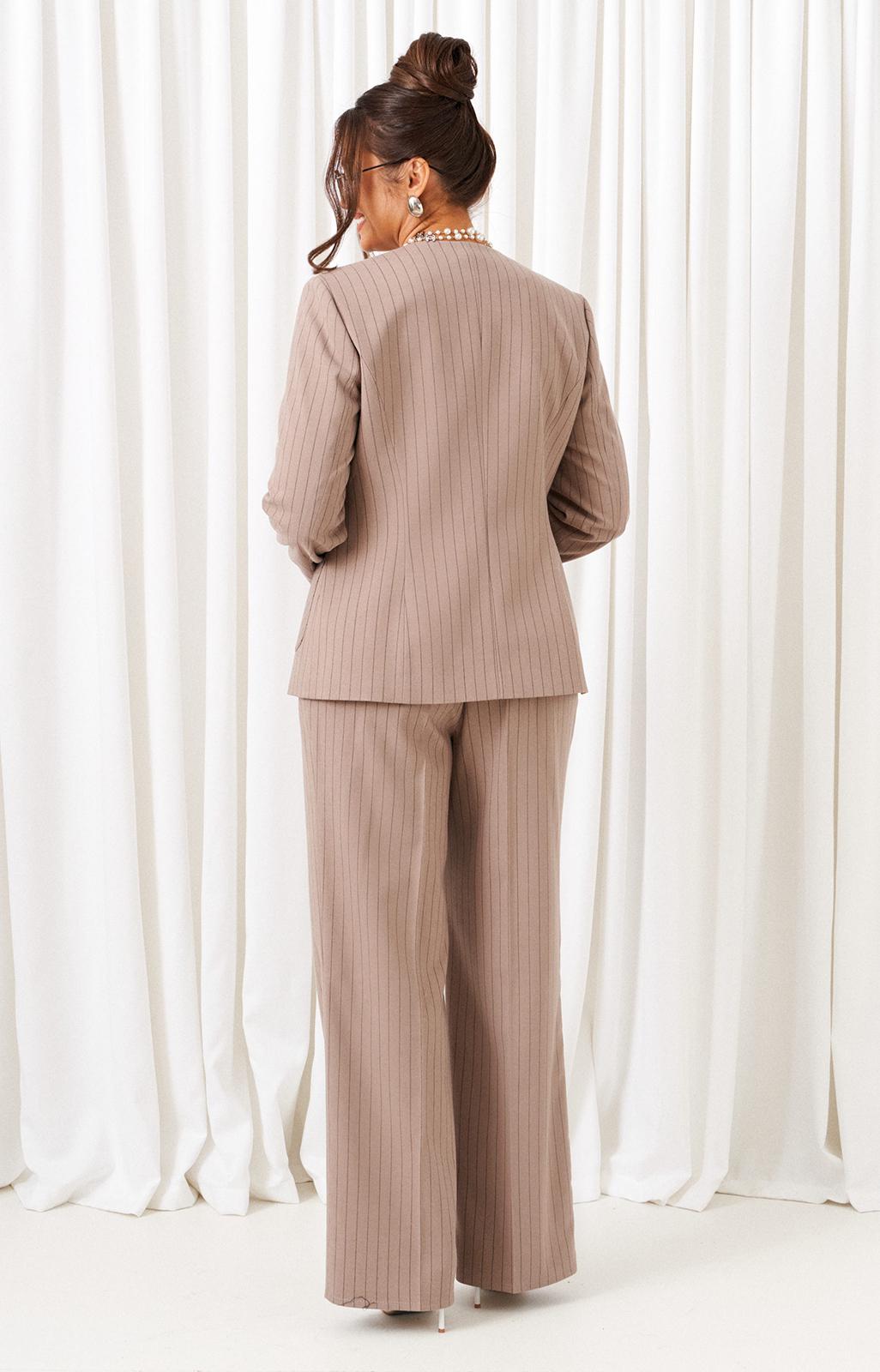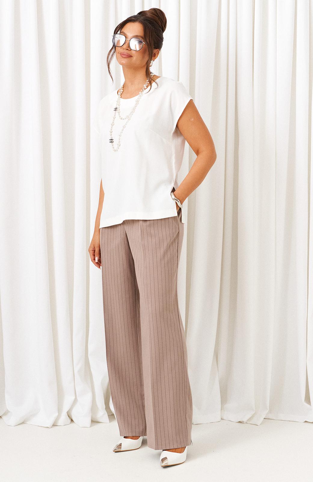 Комплект женский 3-ка, состоящий из жакета, брюк и блузки. Предназначен для повседневного использования. Жакет и брюки выполнены из костюмной ткани высокого качества нежной фактуры, приятной на ощупь, и актуального дизайна в полоску. Блузка изготовлена из вискозного полотна с содержанием натуральных волокон.