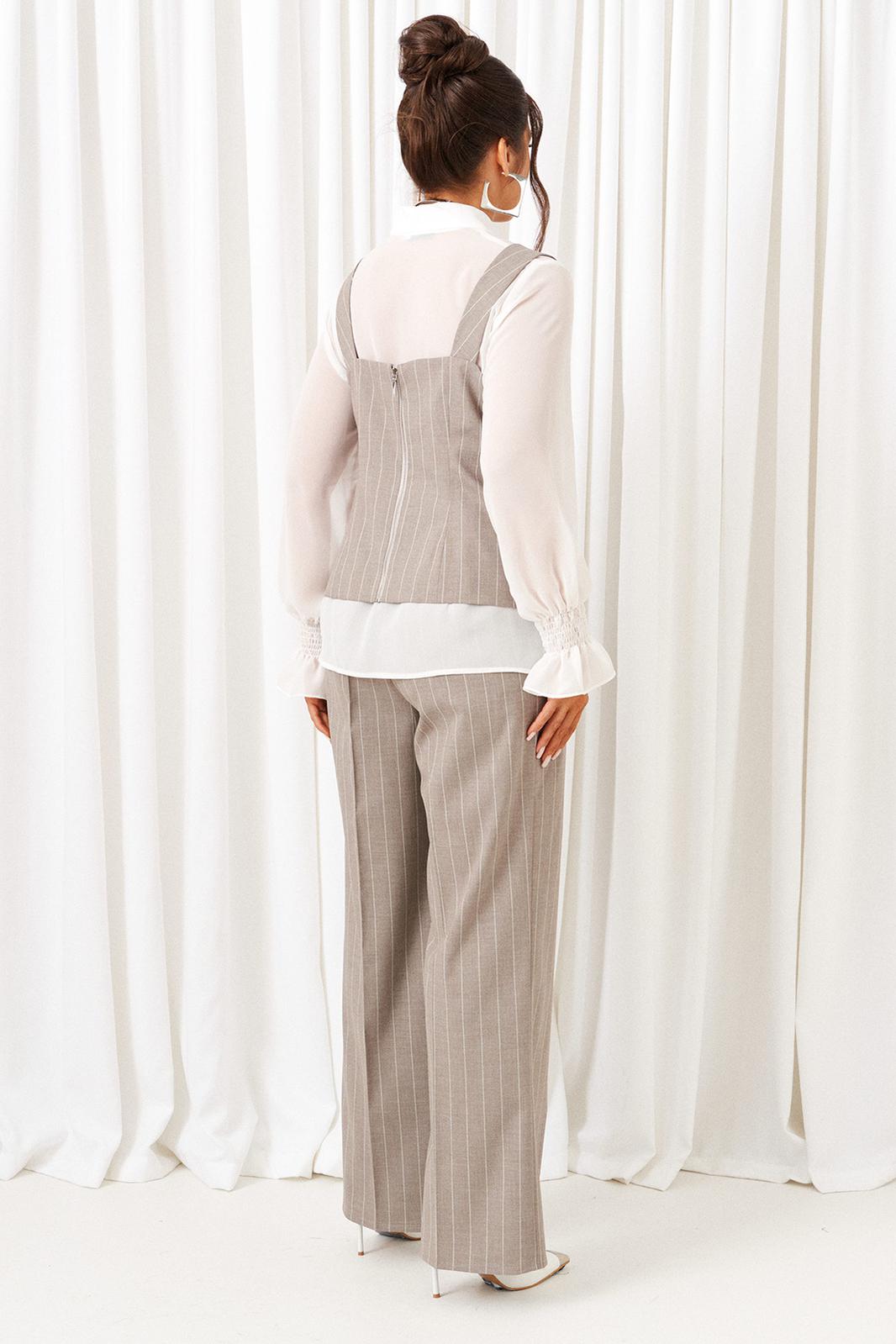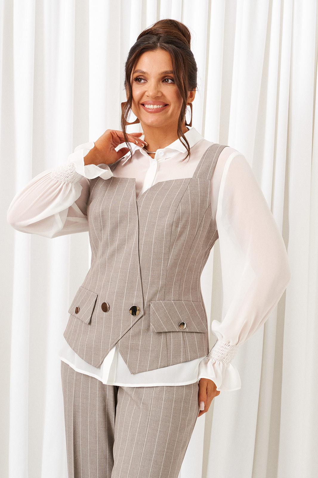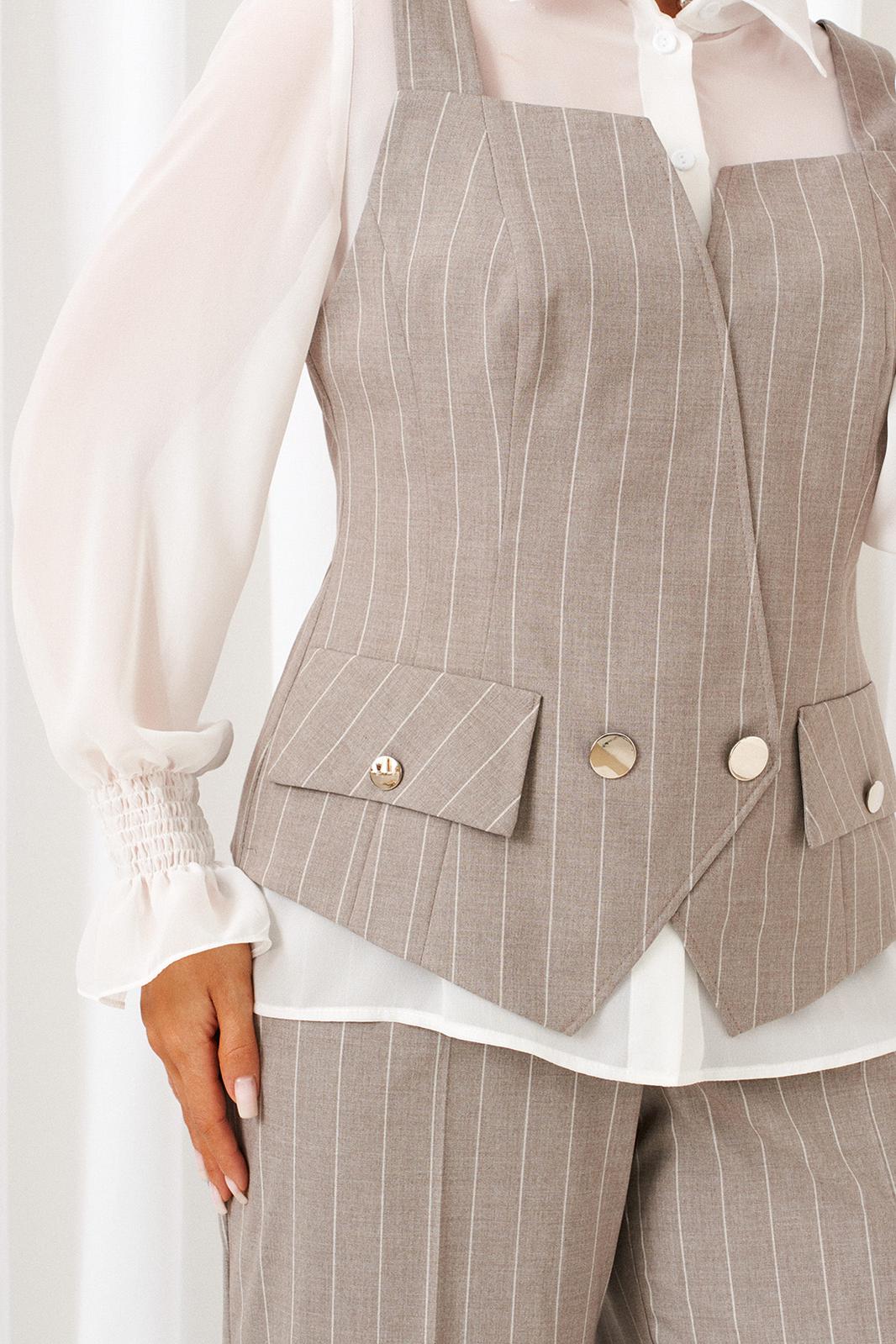 Деловой комплект 3-ка, состоящий из трех предметов: жилета, брюк и блузки. Жилет и брюки выполнены из костюмно-смесового полотна высокого качества стильного дизайна в полоску.
