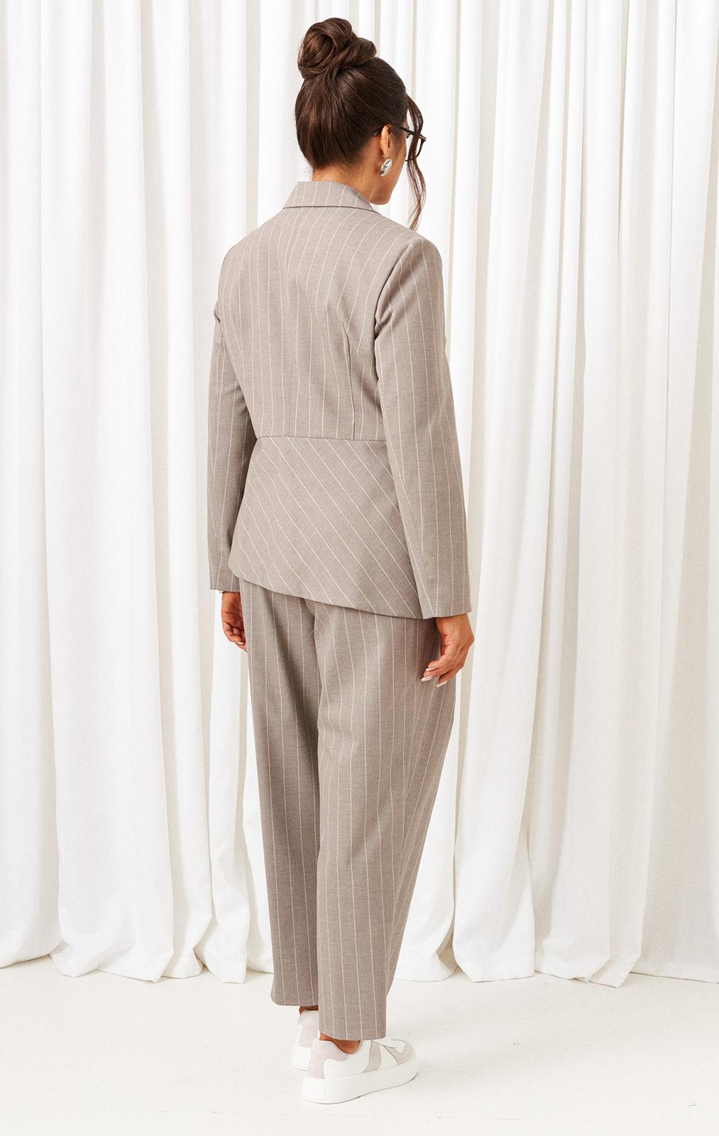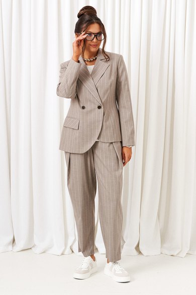 - Тип ткани: жакет, брюки – вискоза 61%, пэ 22%, пан 14%, эластан 3%. блузка – пэ 68%, вискоза 27%, спандекс 5%.