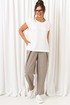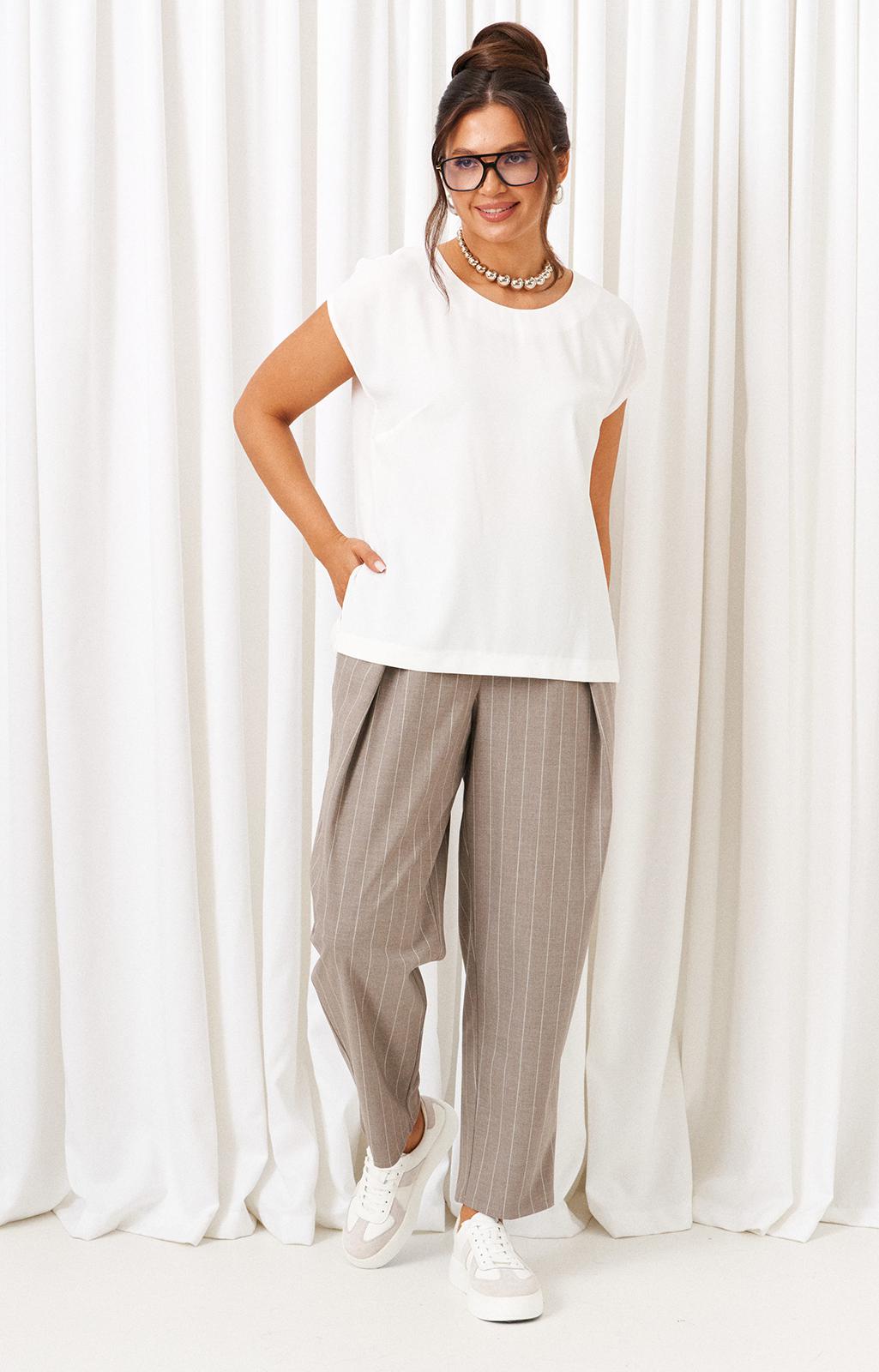 Брюки свободного силуэта расширенные вверху и слегка зауженные к низу, длиной до щиколотки, с двумя верхними боковыми карманами и двумя заложенными глубокими складками от пояса спереди. Высота сиденья классическая.