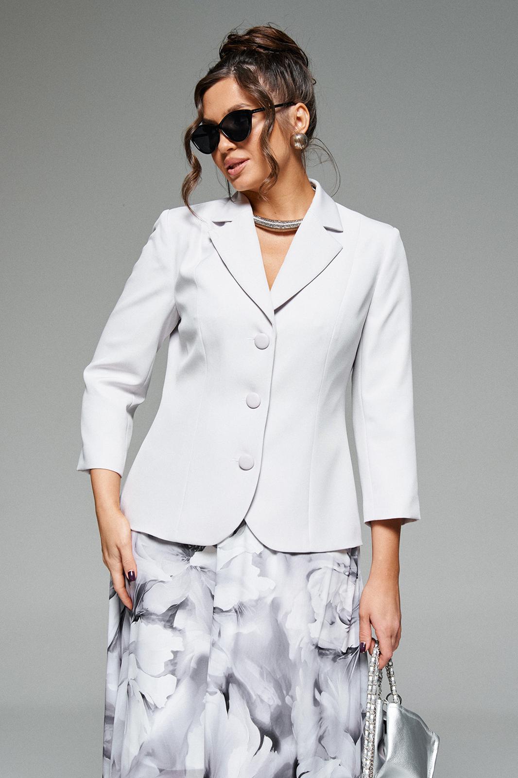 Жакет классический однобортный, на подкладке, прилегающего силуэта. Выполнен из костюмной смесовой ткани.
