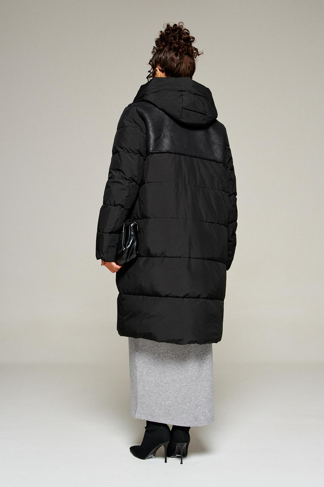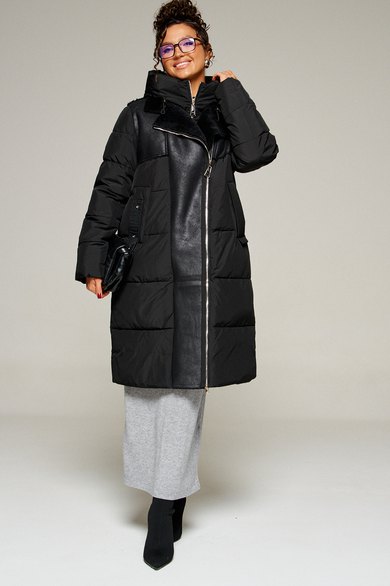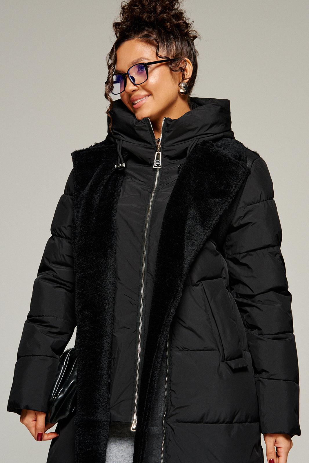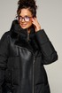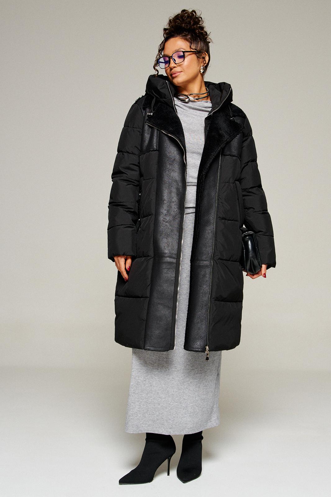 Перед с подрезной кокеткой из экокожи и с симметричными боковыми прорезными карманами с широкой обтачкой, фиксируемые на кнопку. На правом кармане выполнен декоративный элемент в виде широкой репсовой тесьмы. Центральная вставка переда, переходящая в воротник, выполнена из двусторонней экокожи, где внутренняя сторона – искусственный мех «овчина».