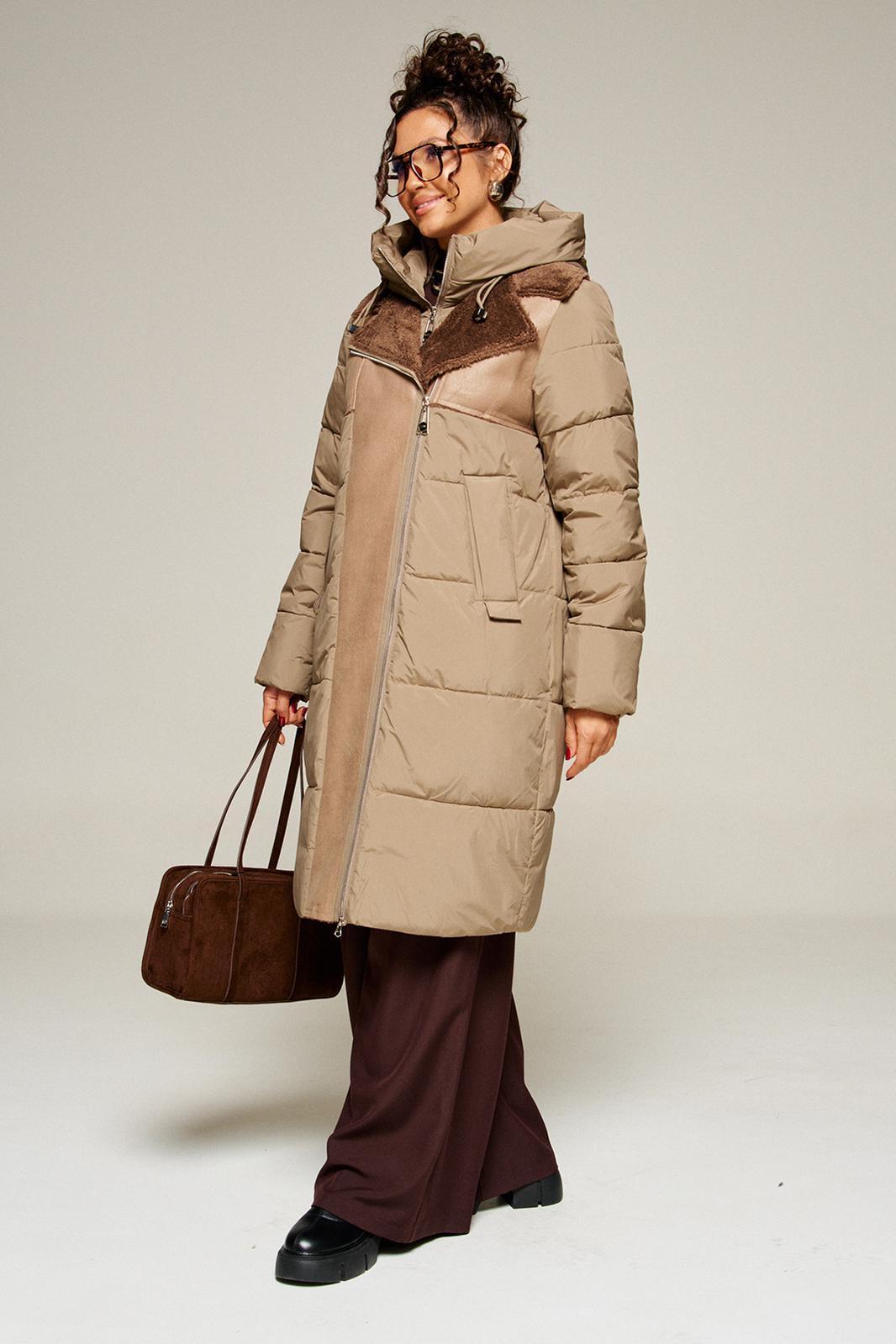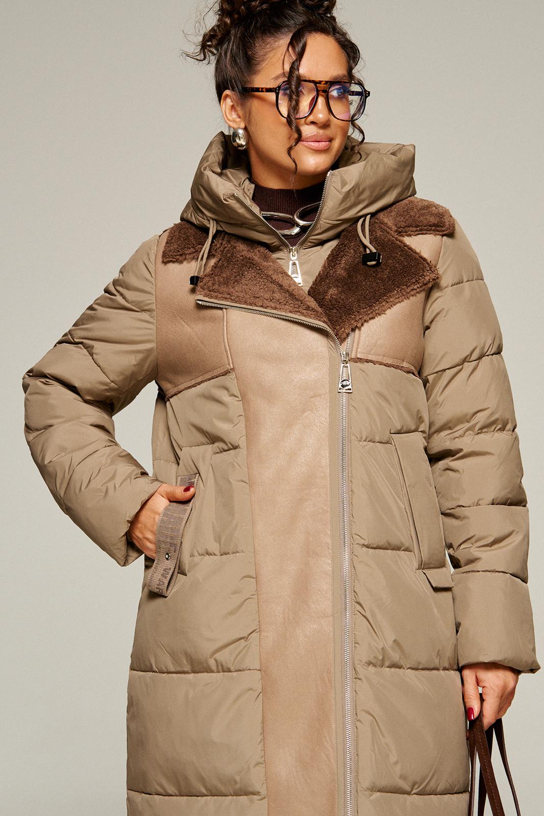 Перед с подрезной кокеткой из экокожи и с симметричными боковыми прорезными карманами с широкой обтачкой, фиксируемые на кнопку. На правом кармане выполнен декоративный элемент в виде широкой репсовой тесьмы. Центральная вставка переда, переходящая в воротник, выполнена из двусторонней экокожи, где внутренняя сторона – искусственный мех «овчина».