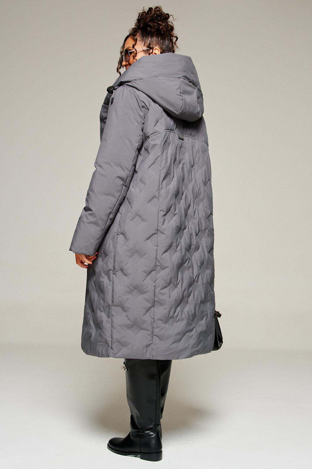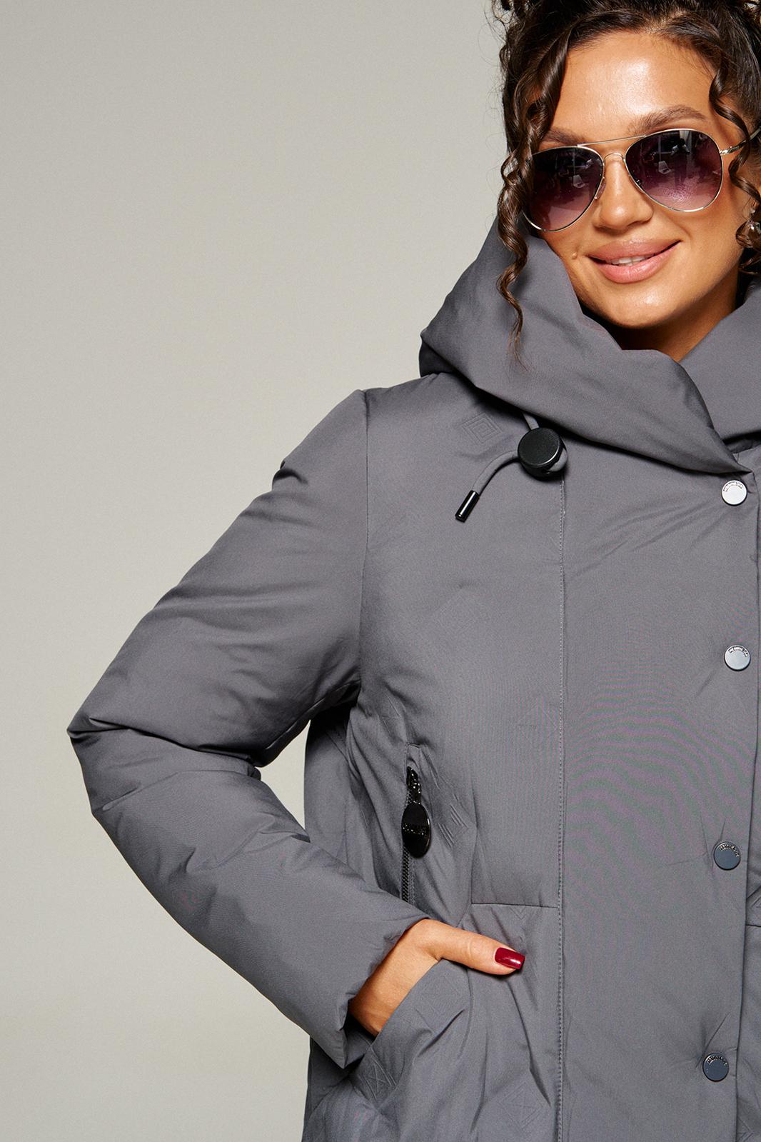 Капюшон умеренного объема. По периметру капюшона с внешней стороны вставлен шнур в цвет изделия с декоративными фиксаторами и наконечниками.