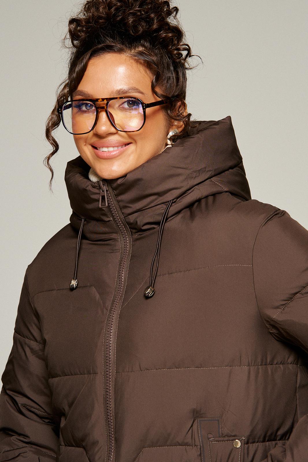 Капюшон умеренного объема, застегиваемый спереди. По периметру капюшона вставлен шнур в цвет изделия с декоративными фиксаторами.