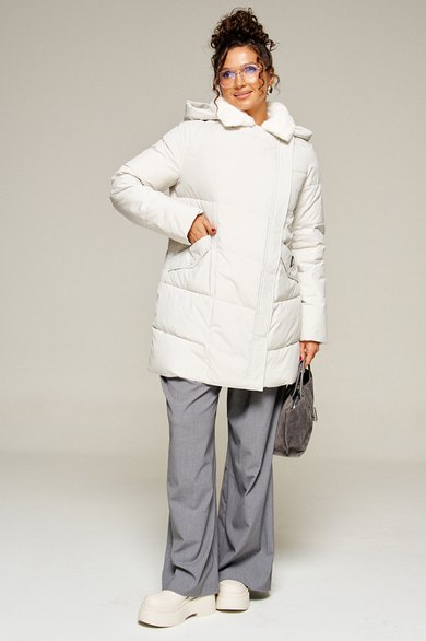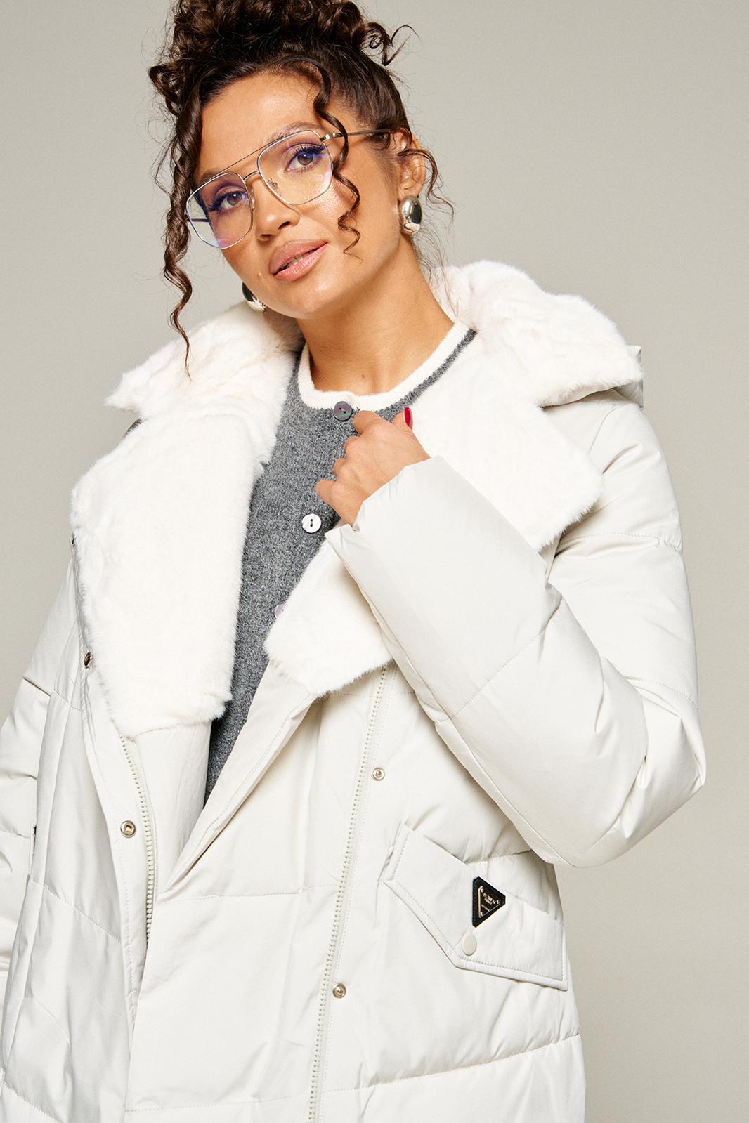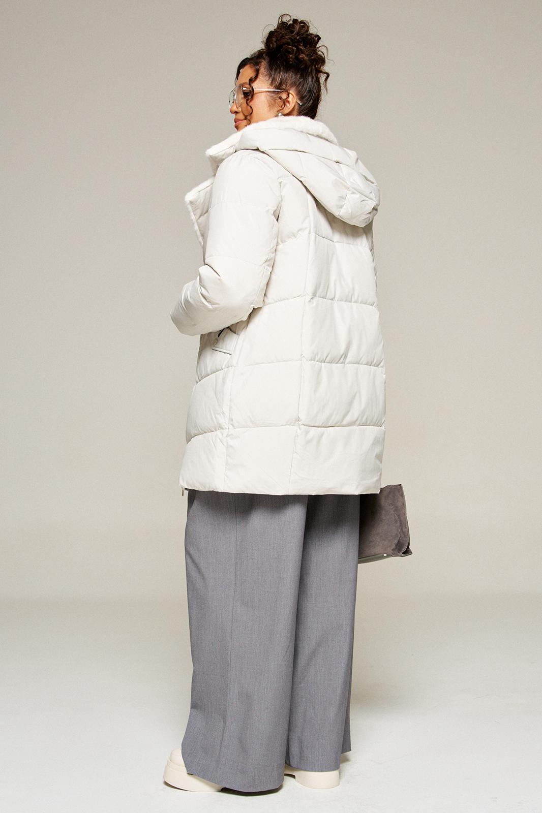 Воротник пиджачного типа с возможностью застегивания до верха. Внутренняя часть воротника и лацканы обработаны искусственным мехом.
