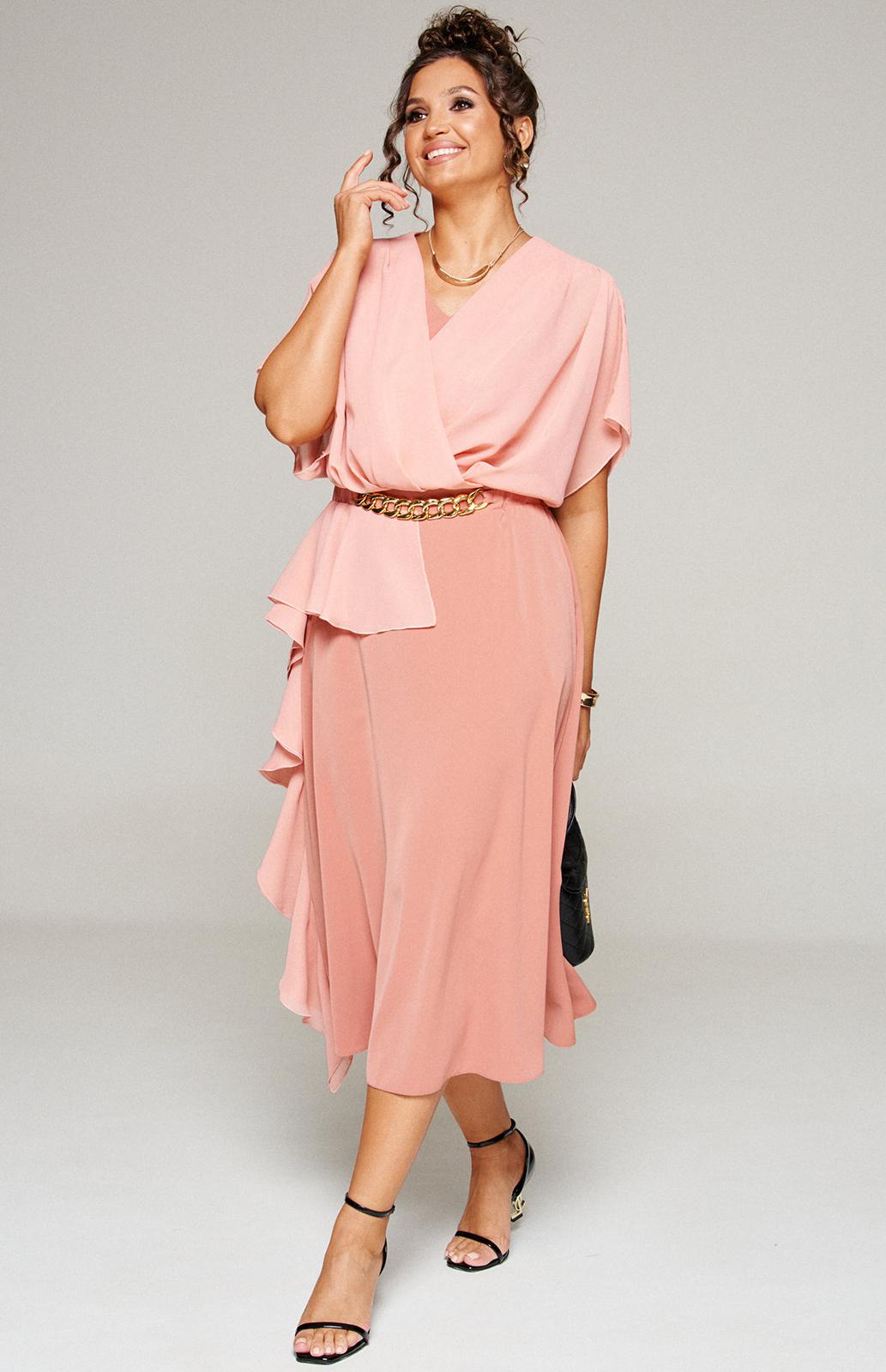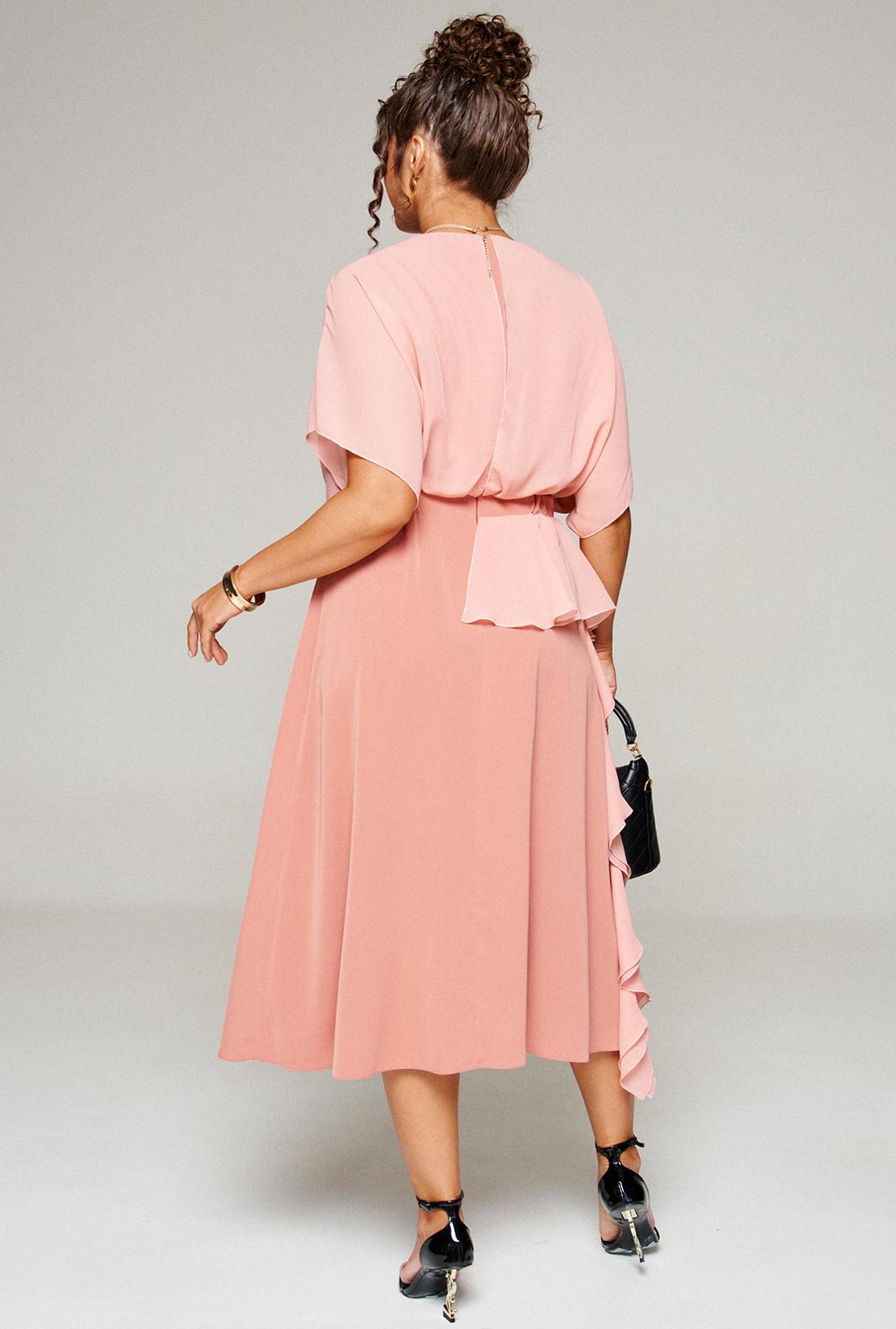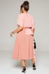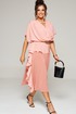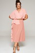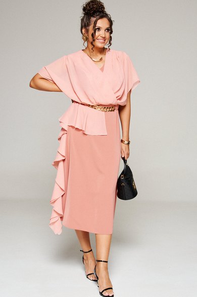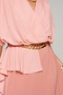 На талии расположен пояс, который спереди декорирован отделочным элементом «цепь», а на боковых участках вставлена эластичная тесьма. Справа на юбке спереди и сзади располагаются асимметричные воланы, которые переходят в боковой шов.