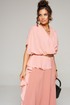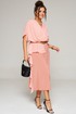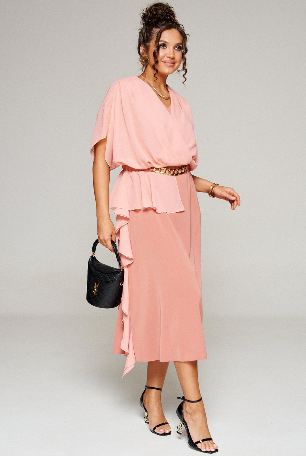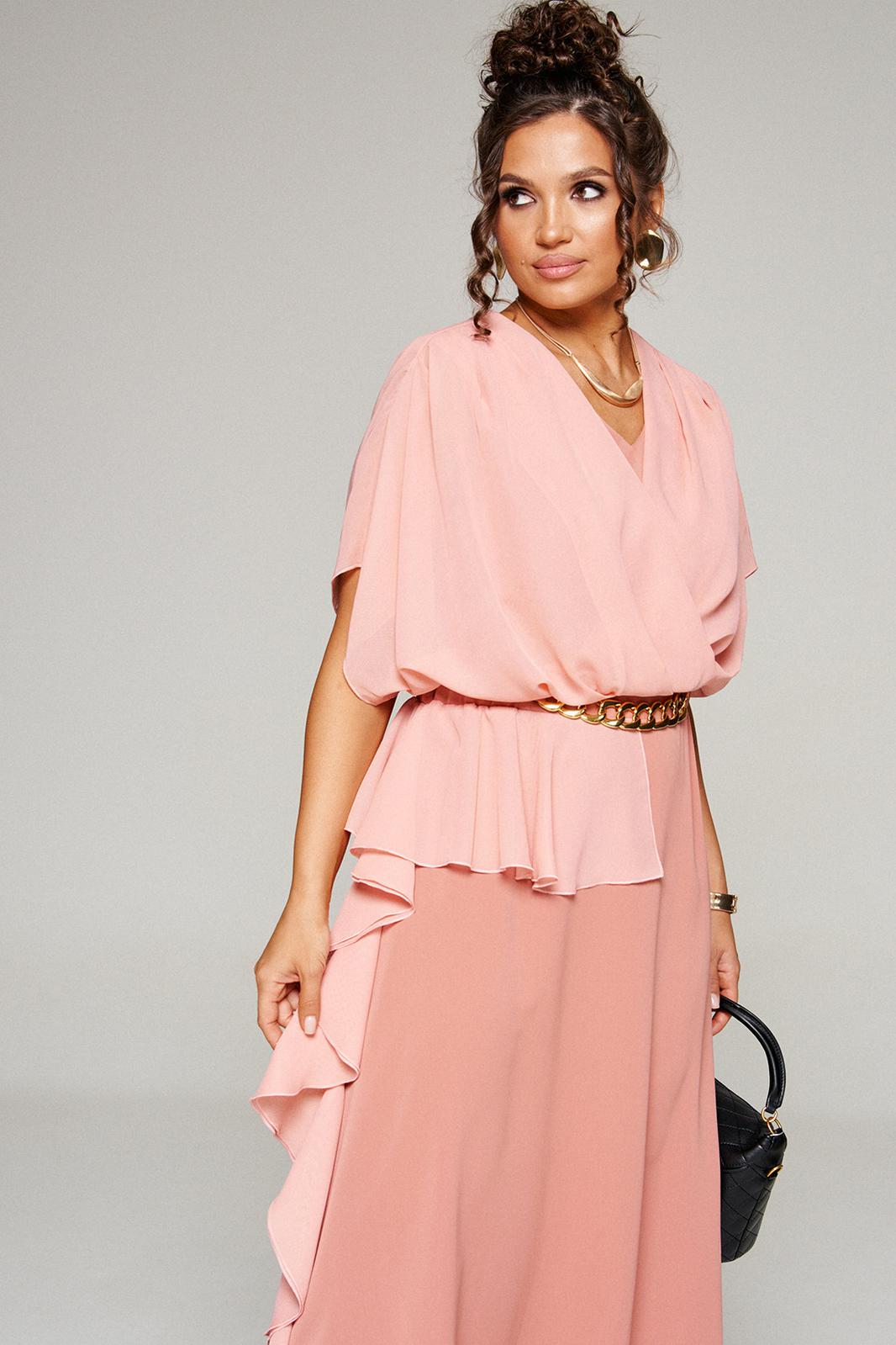 Платье женское в нарядно-романтическом стиле, отрезное по линии талии и декорированное отделочным элементом «под золото», выполнено из комбинации двух тканей: лёгкого струящегося шифона и смесового полотна. У этой ткани нежная, гладко-бархатистая фактура, приятная на ощупь и матовая поверхность, она легко драпируется и очень выгодно и дорого подчеркивает неповторимость образа, а шифон дополняет изысканностью и придаёт индивидуальность.